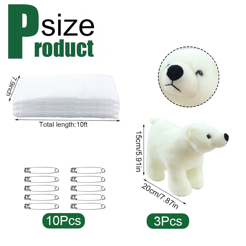 You will get 1 fake snow blanket, 5 stuffed penguins /3 stuffed polar bears and 10 pins, nice combination more than enough to meet your decorating needs and add a strong Christmas atmosphere to your home.