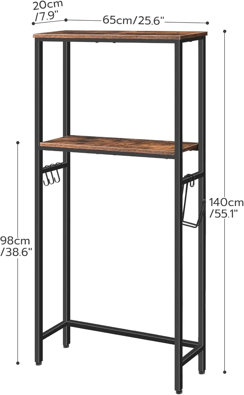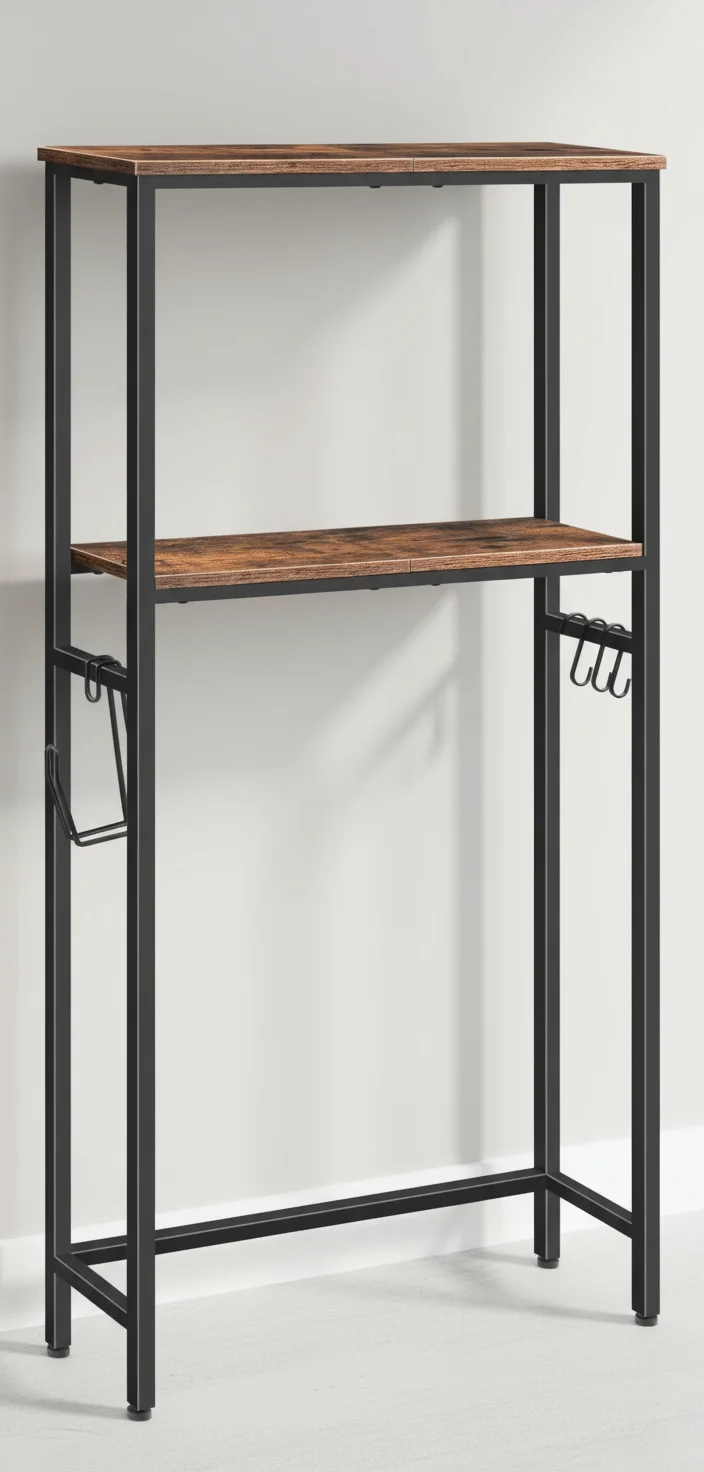Transform your bathroom into a clutter-free oasis with our elegant 2-tier over the toilet storage solution! Imagine having all your essentials perfectly organized and within arm's reach – this freestanding organizer makes it possible while maximizing every inch of your precious space. ✨ **SPACE-SAVING DESIGN PERFECT FOR ANY BATHROOM** Measuring 25.6"L x 7.9"W x 55.1"H, this compact storage cabinet cleverly utilizes the often-wasted area above your toilet. Whether you're dealing with a cozy apartment bathroom or simply want to declutter your family restroom, this organizer creates valuable storage without compromising floor space. The adjustable feet ensure perfect stability on any surface, giving you peace of mind while keeping your bathroom beautifully organized. 🎯 **SMART ORGANIZATION FOR ALL YOUR ESSENTIALS** Experience the convenience of having everything exactly where you need it! The two spacious open shelves comfortably hold bath towels, decorative items, scented candles, lush greenery, or your favorite skincare products. Below, three sturdy hooks keep robes and towels neatly hung, while the integrated toilet paper holder ensures you'll never search for rolls again. Everything has its perfect place, creating a harmonious and functional bathroom environment. 🏠 **VERSATILE ENOUGH FOR ANY ROOM IN YOUR HOME** While designed for bathrooms, this storage shelf adapts beautifully to any space needing organization! Use it in your laundry room to sort detergents and supplies, place it in the bedroom corner for extra storage, or transform it into a charming display unit for living room decor. The rustic brown finish paired with sleek black metal frame brings warm industrial elegance that complements any interior style – from modern minimalist to farmhouse chic. 💪 **BUILT TO LAST WITH PREMIUM MATERIALS** Crafted from high-quality particleboard and reinforced with a durable black metal frame, this storage shelf supports up to 33 pounds per shelf – strong enough for heavy towels, multiple toiletry bottles, or decorative accents. The smooth finish not only adds sophistication but also makes cleaning effortless – just a quick wipe keeps it looking brand new. 🚀 **EFFORTLESS ASSEMBLY FOR INSTANT ORGANIZATION** We know your time is valuable! That's why we've designed this storage solution with straightforward assembly in mind. Clear instructions and all necessary tools are included, allowing you to transform your space in minutes rather than hours. No special skills required – just follow the simple steps and enjoy your newly organized sanctuary! 🌟 **WHY CHOOSE THIS BATHROOM ORGANIZER?** • Maximizes unused vertical space above your toilet • Multiple storage options with shelves and hooks • Elegant rustic design enhances any decor • Durable construction supports heavy items • Quick and easy assembly process • Perfect for apartments, small homes, and busy families Picture yourself stepping into a beautifully organized bathroom every morning – no more searching for toilet paper or tripping over scattered items. This isn't just storage; it's an upgrade to your daily routine and home aesthetics. Join thousands of satisfied customers who have transformed their spaces with this versatile organizer! The journey to a perfectly organized home starts here. Click 'Add to Cart' now and experience the difference that smart storage makes in your daily life!