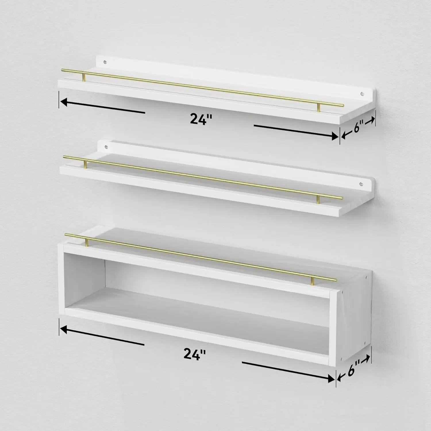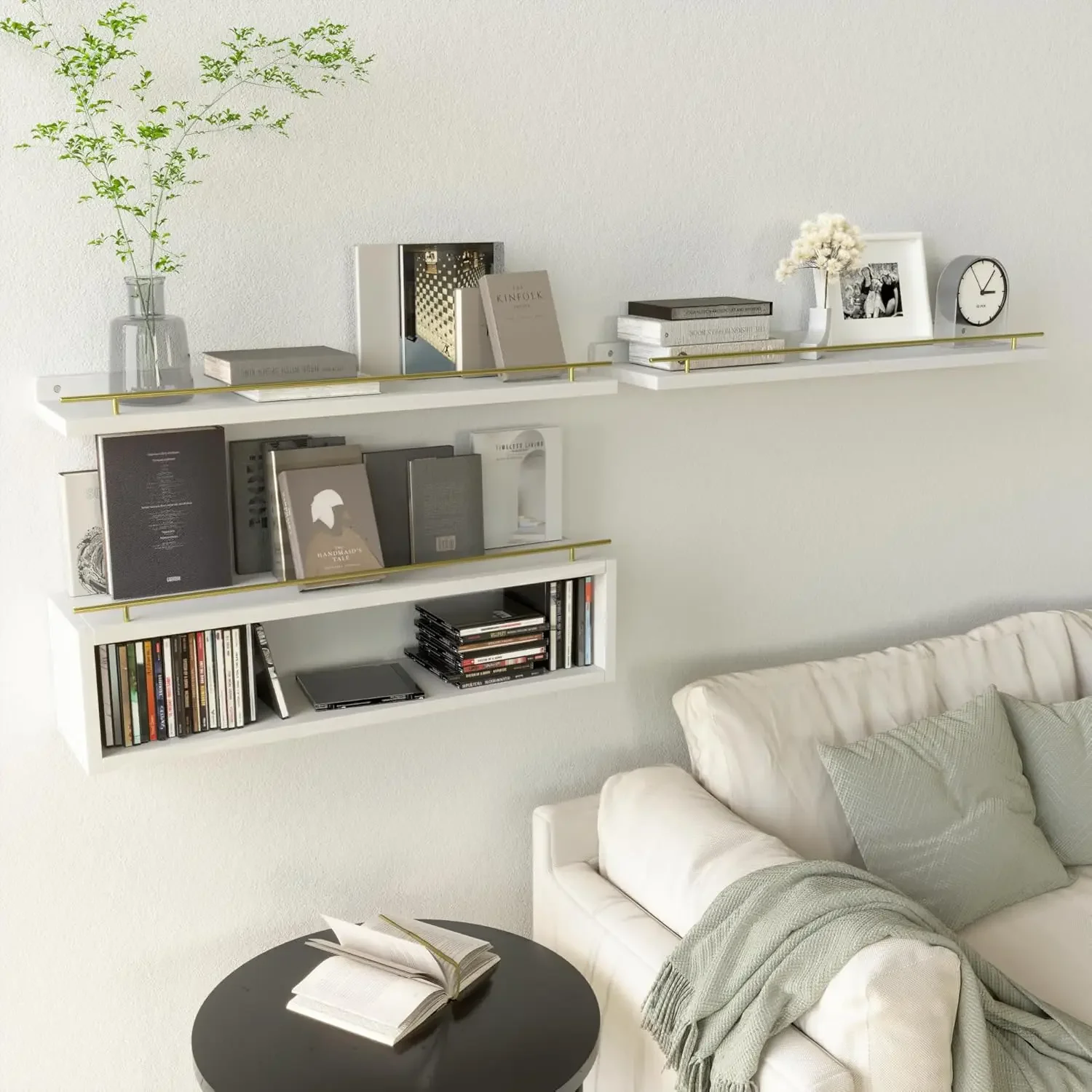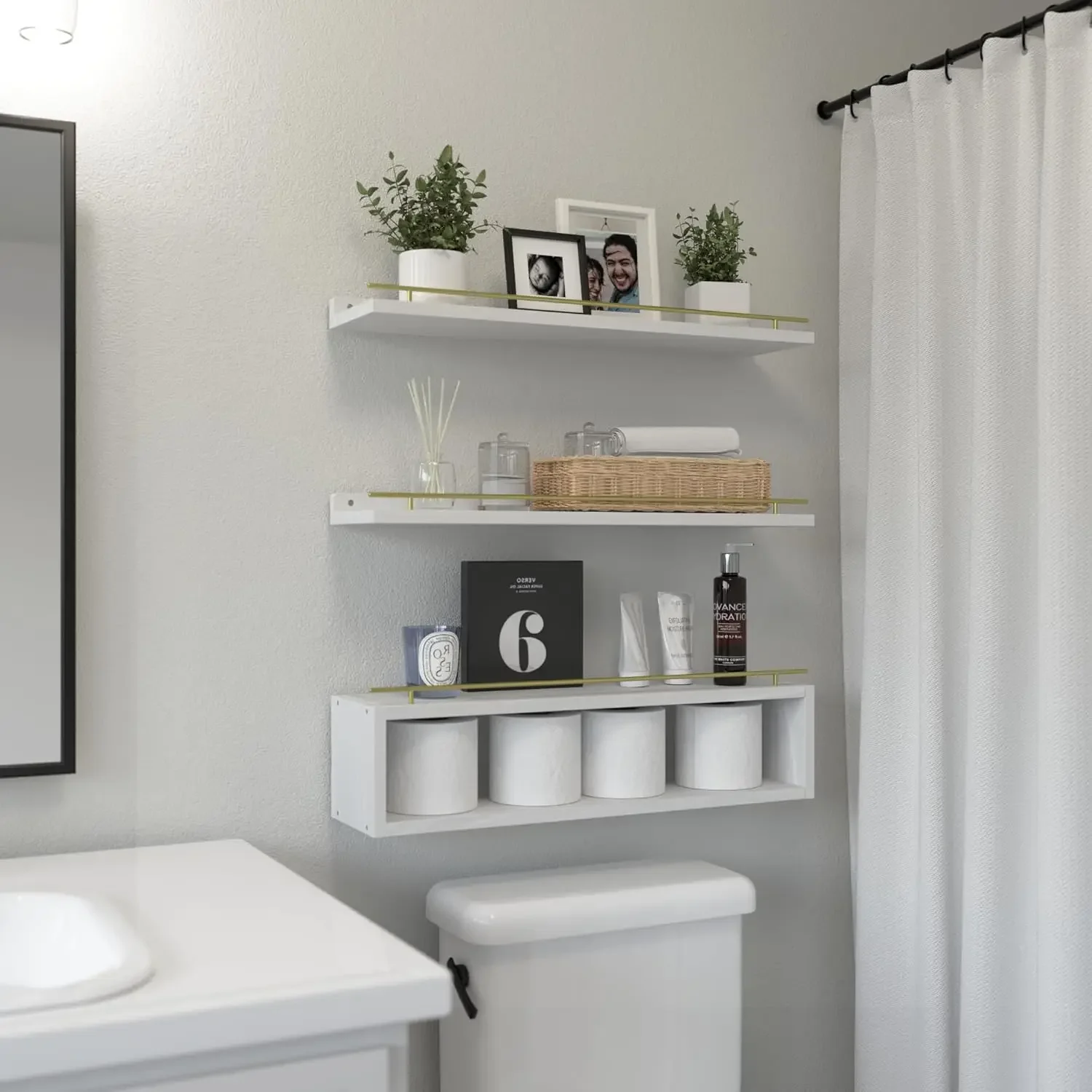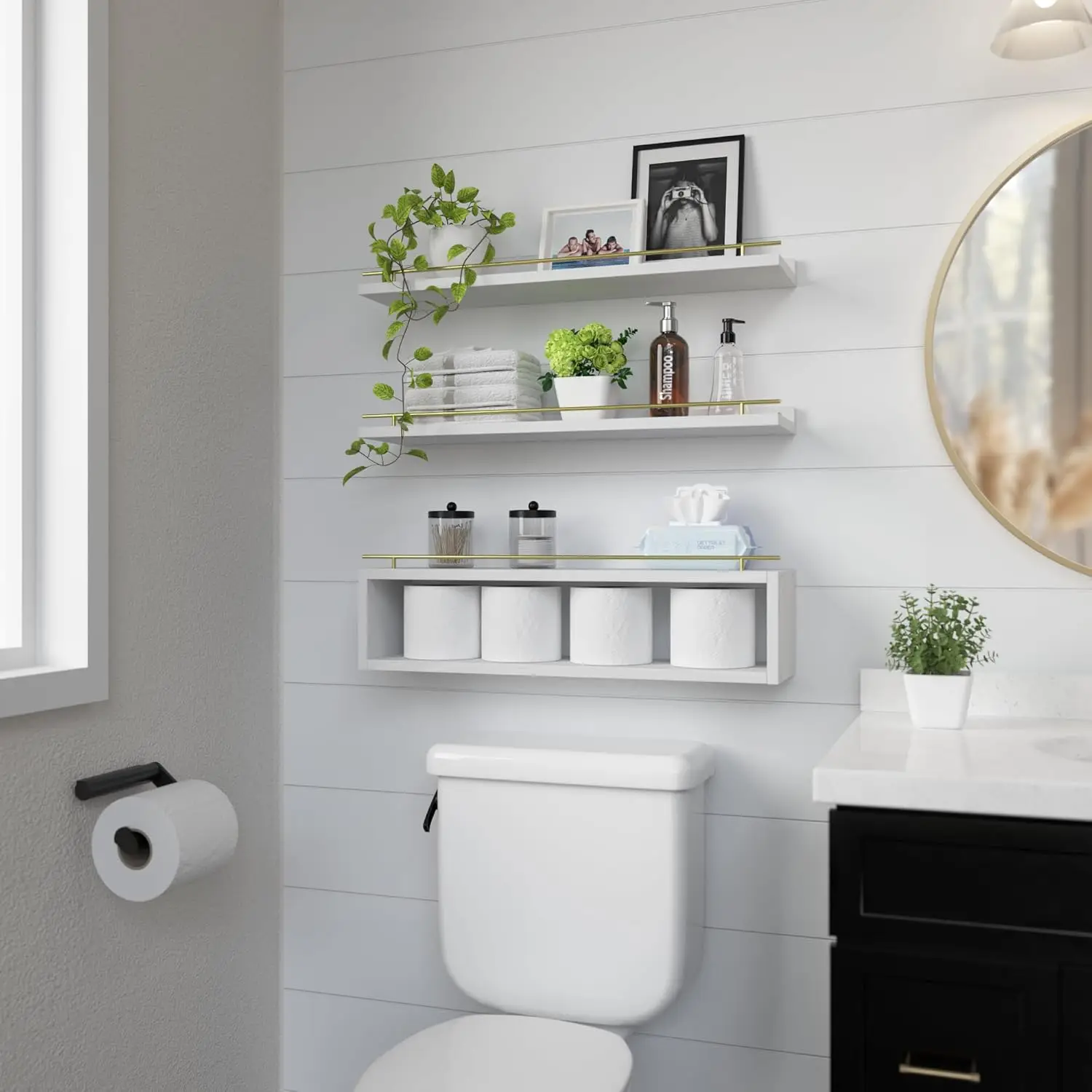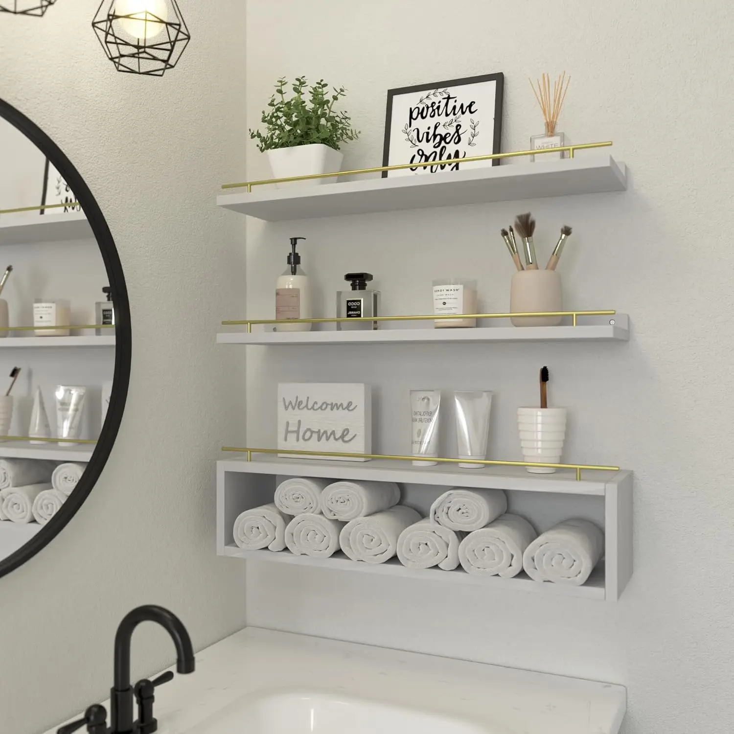 [Beautiful and Practical Metal Rails] - Beyond their stylish, gleaming appearance, the metal rails effectively prevent items from falling from each shelf, providing secure storage for bathroom essentials like toilet paper, towels, fragrances, and various toiletries. When installed in your living room, the rails provide excellent support for artwork, magazines, and picture frames that don't require brackets. It's time to spruce up your home with new ideas.
