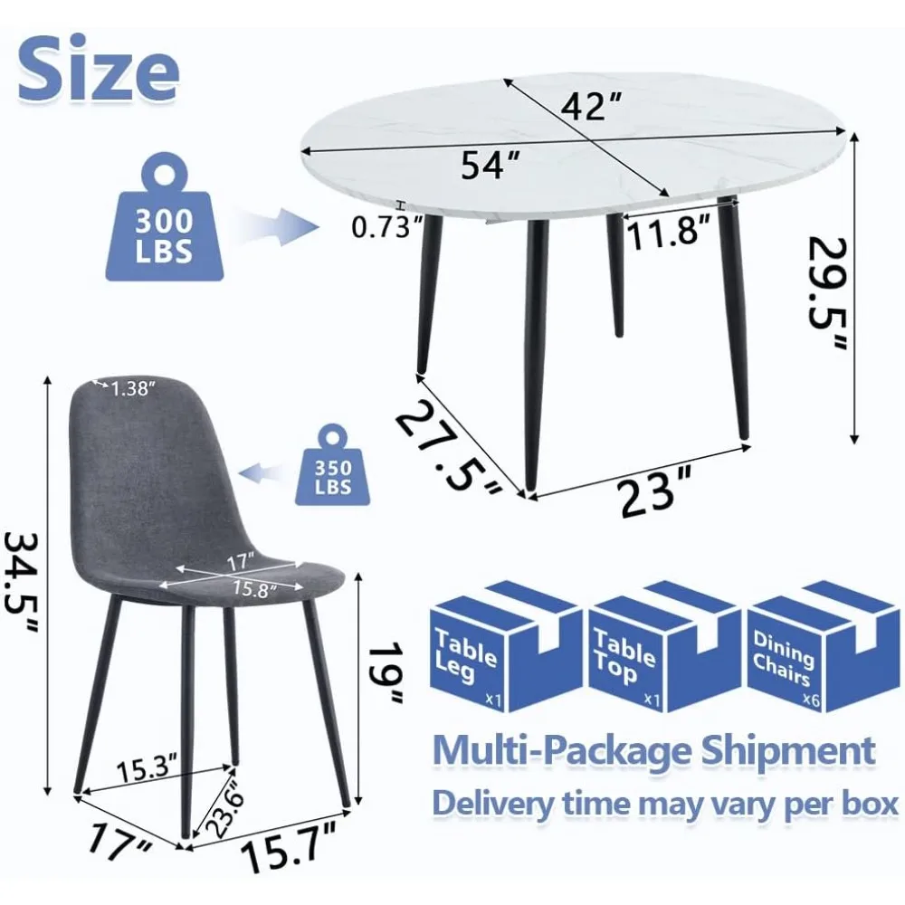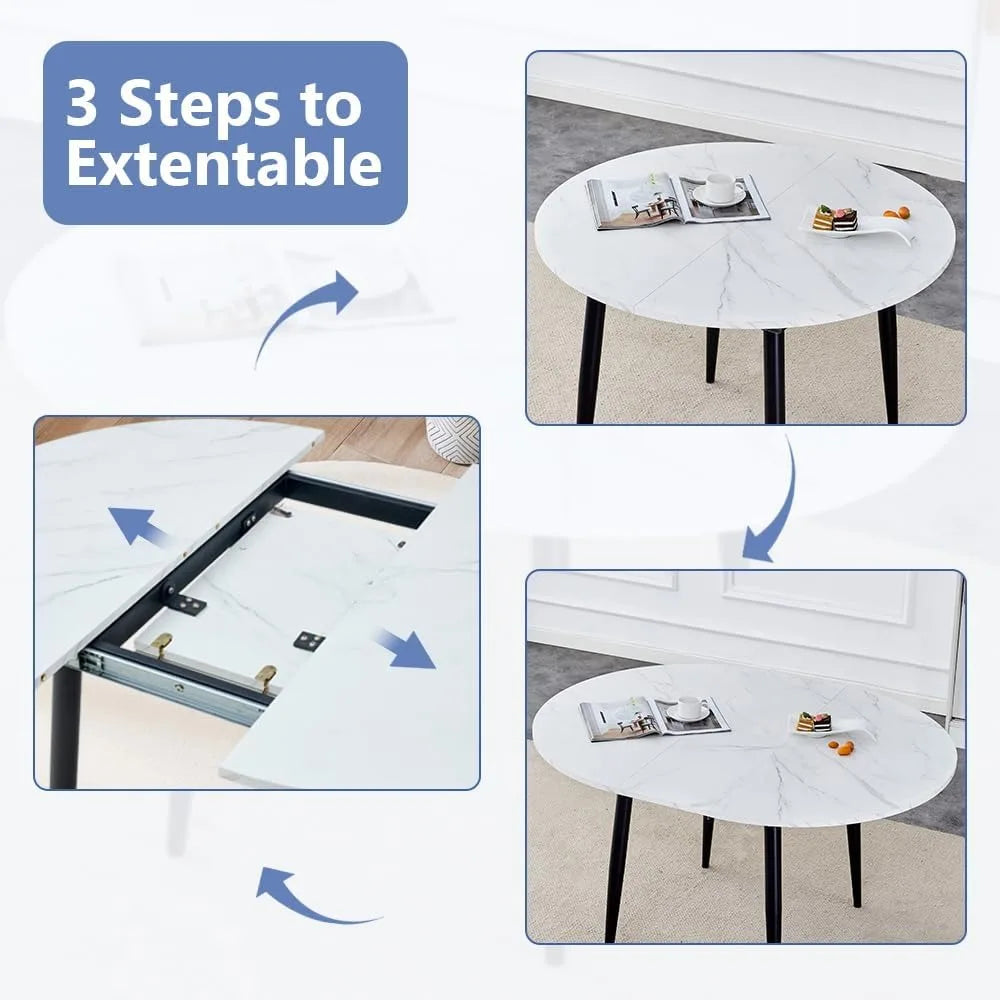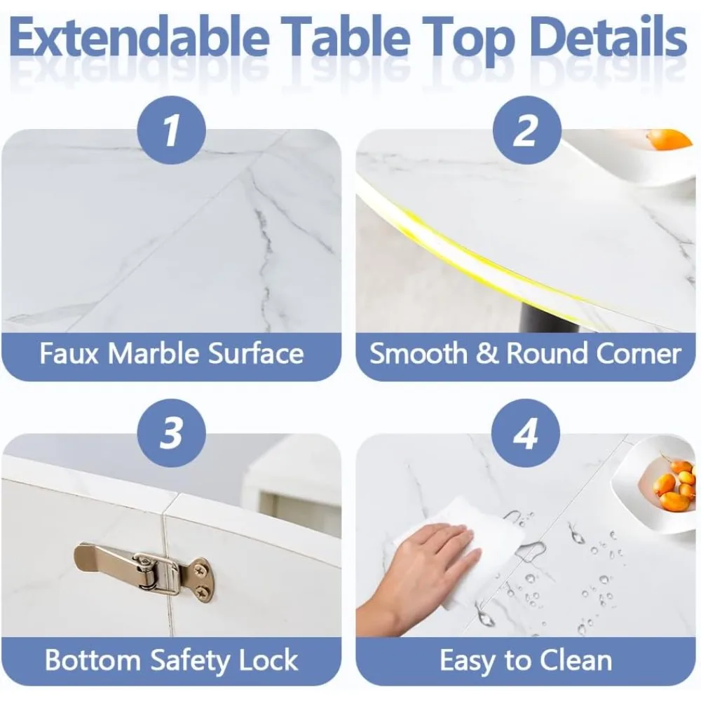 - White Kitchen Table Set for 6: This space saving dining table set features a white marble pattern tabletop made of MDF and sturdy metal legs for enhanced stability and long-lasting durability. This extendable dining room table set extends silently in just 1 minute, providing reliable performance and long-lasting durability. Weight capacity: 300 lbs.