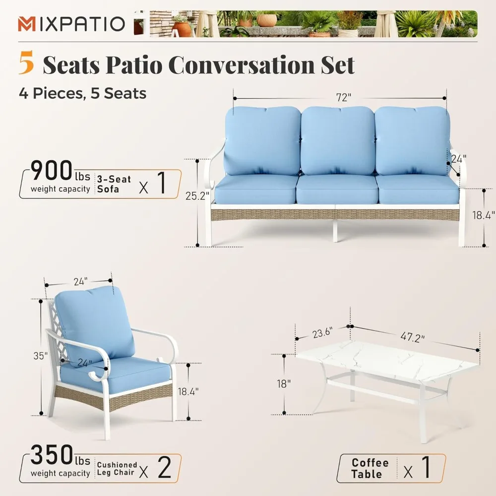 4Piece Patio Furniture Set,2 x Fixed Chair,1 x3-Seat Sofa with Marbling Coffee Table,All Cushioned 5 Seats Outdoor Conversation