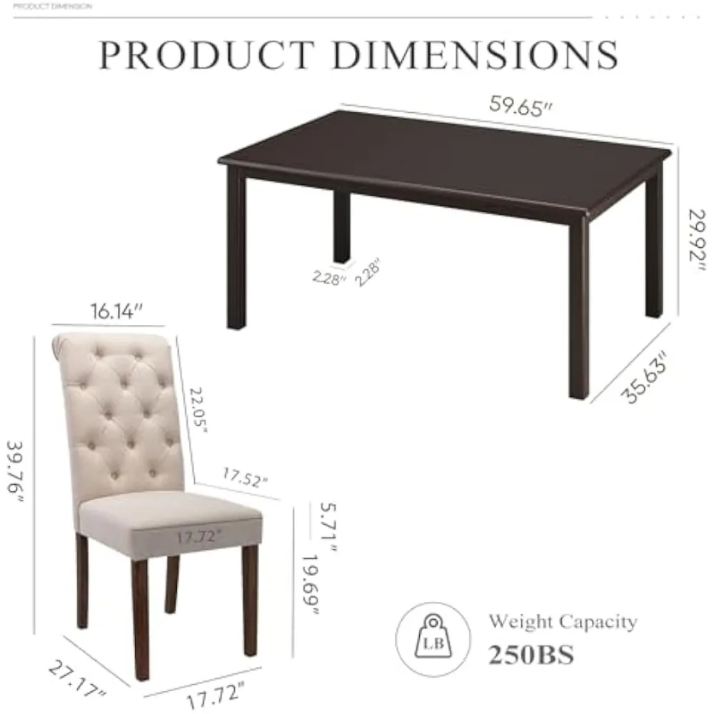 7-Piece Dining Table Set for 6, 60" Rectangular Wooden Kitchen Table with 6 Tufted Dining Room Chairs, Brown/Beige