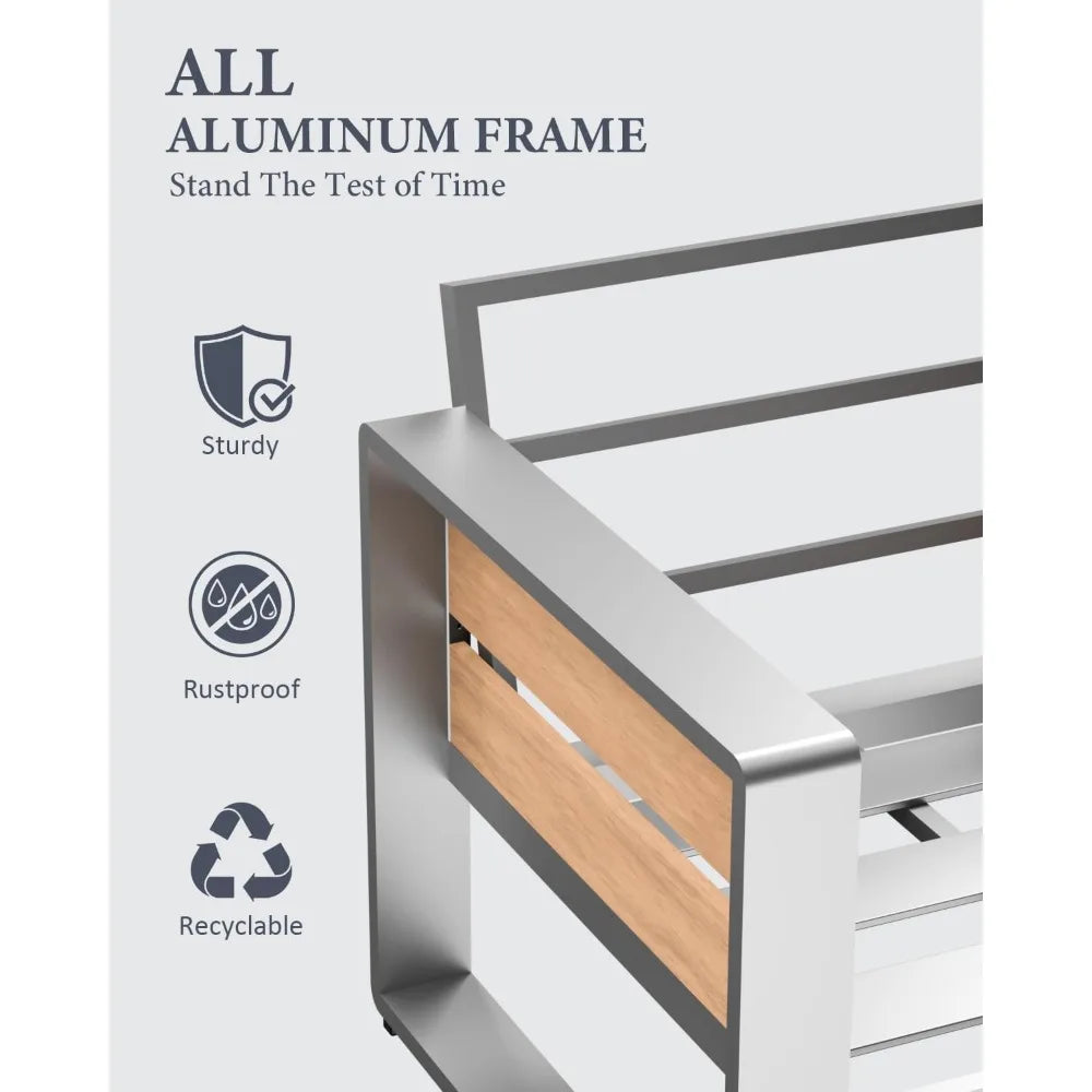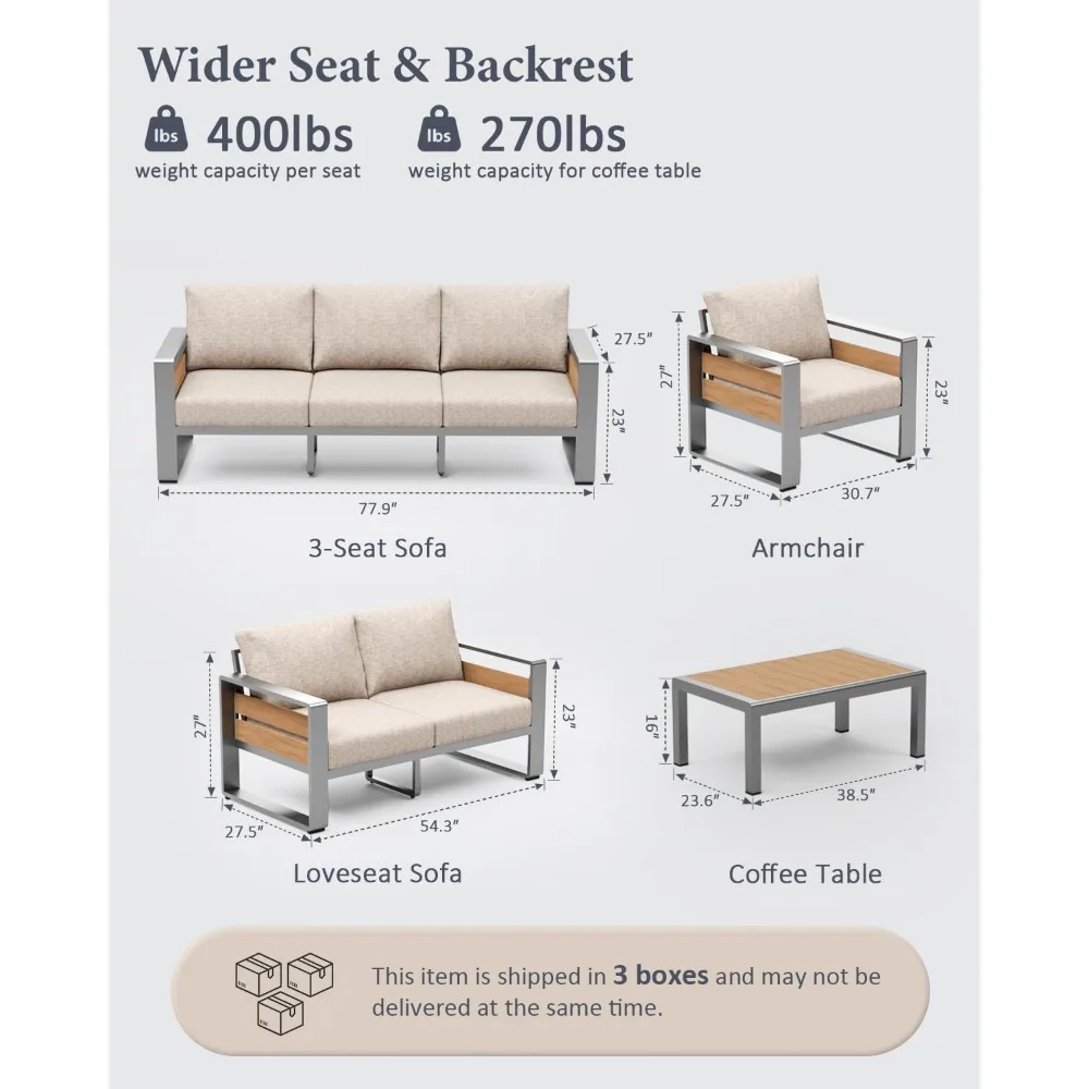 This outdoor furniture set boasts a rust-resistant aluminum frame and stainless steel screws, making it suitable for year-round outdoor use. It's designed to withstand various weather conditions, including rain, snow, and sun exposure, while remaining water-resistant and rust-free. The lightweight construction allows for easy movement and repositioning, making it ideal for poolside areas, backyards, balconies, gardens, and decks. The outdoor sofa set features spacious seating with a superior weight capacity, providing ample space and comfort for people of all sizes. The loveseat can hold up to 800 lbs, ensuring safety and reliability for solo or group use. The set includes 5.5" removable and machine-washable seat cushions, which are filled with high-density sponge for better upper-body support. The cushions are designed to be stable, preventing them from sliding around. The cushion covers are easily removable for cleaning, helping to maintain the set's appearance. Non-slip foot pads are included to provide a secure grip on various surfaces, enhancing stability and protecting floors from scratches or damage. The modern coffee table features imitation wood, offering both aesthetic appeal and excellent moisture and water resistance. Assembly is straightforward, requiring no tools and following clear online video instructions with numbered parts. The loveseat sofa is shipped in one box, and customer service is available 24/7 to assist with any issues such as missing parts or damage, ensuring complete satisfaction.
