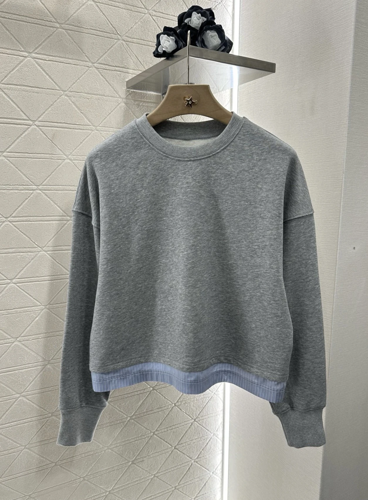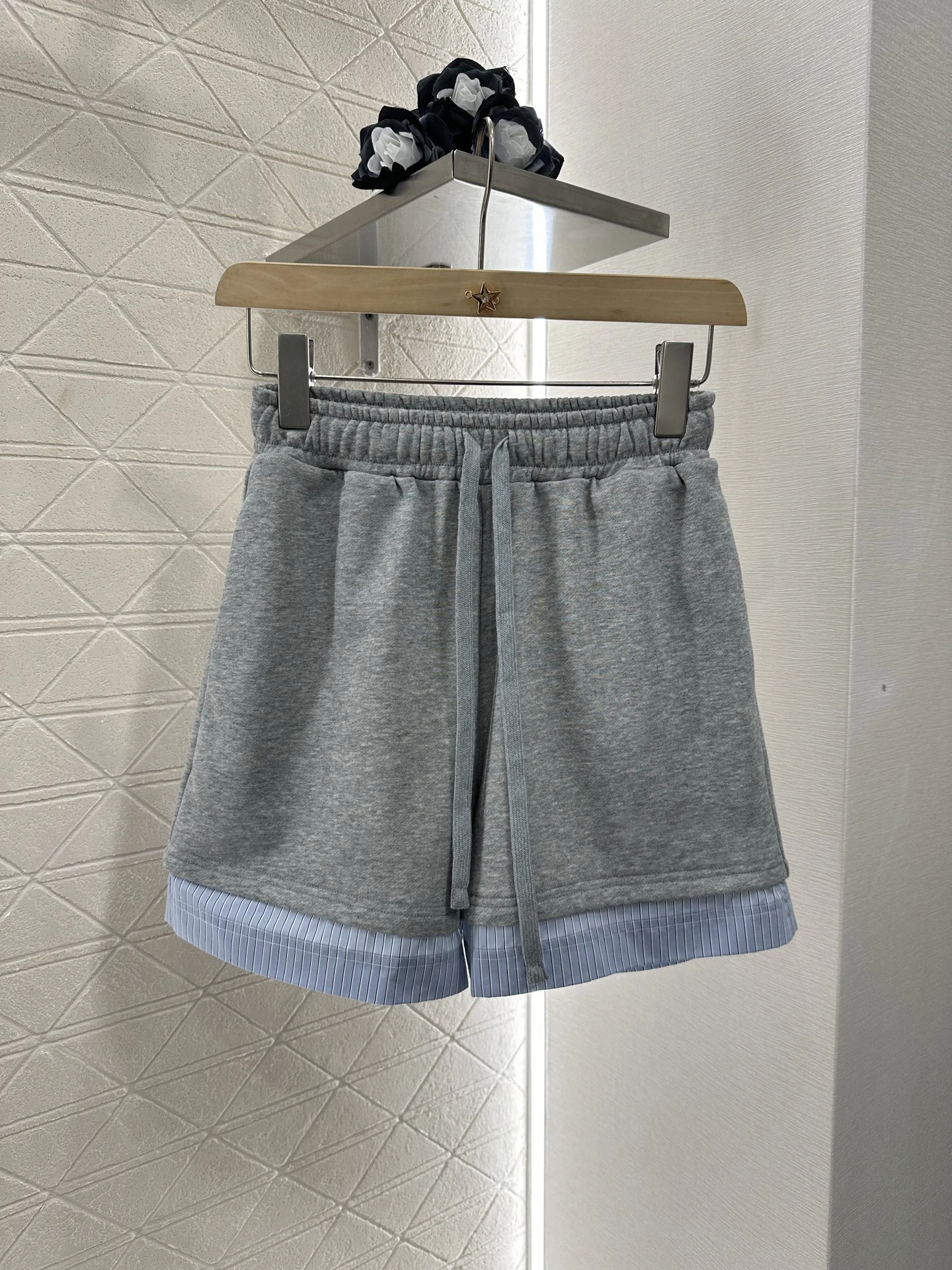 Blue and white striped crew neck sweatshirt and shorts