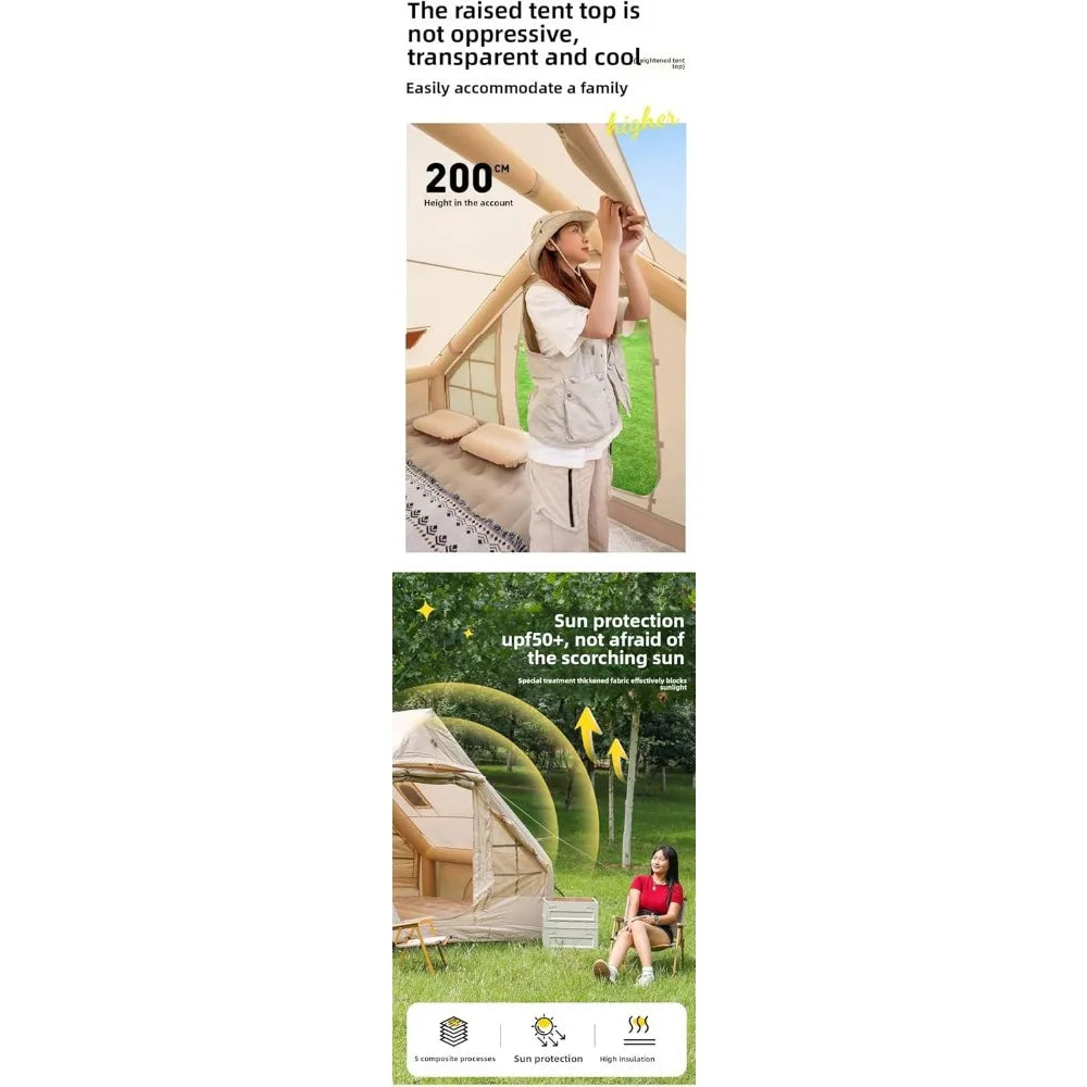 - (Waterproof and Sun Protection) The entire tent is made of 420D high density oxford fabric, which is durable and practical. The surface of camping tent has a waterproof rating of 3000mm and a bottom of 5000mm. The 50+ UV protection inflatable camping tent provides excellent UV protection, so the tent is suitable for all seasons