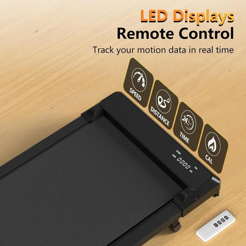 This walking pad is designed with an adjustable incline feature, allowing users to switch between horizontal and incline modes to simulate hill climbing and enhance calorie burning. It supports users up to 265 pounds and is equipped with a powerful yet quiet motor, ensuring a peaceful workout without disturbing others. The non-slip running belt and shock reduction system, with six shock-absorbing points, protect joints and prevent slipping, making it suitable for those with leg injuries or in recovery. The 39.4-inch by 19.7-inch walking surface is spacious and comfortable. The LED display and smart remote control provide real-time tracking of speed, time, calories, and distance, with adjustable speeds ranging from 0.6MPH to 3.8MPH to match your exercise rhythm. The portable design, with a height of 5.7 inches and built-in pulleys, makes it easy to move and store, allowing for convenient placement in any corner of your home or under furniture when not in use.