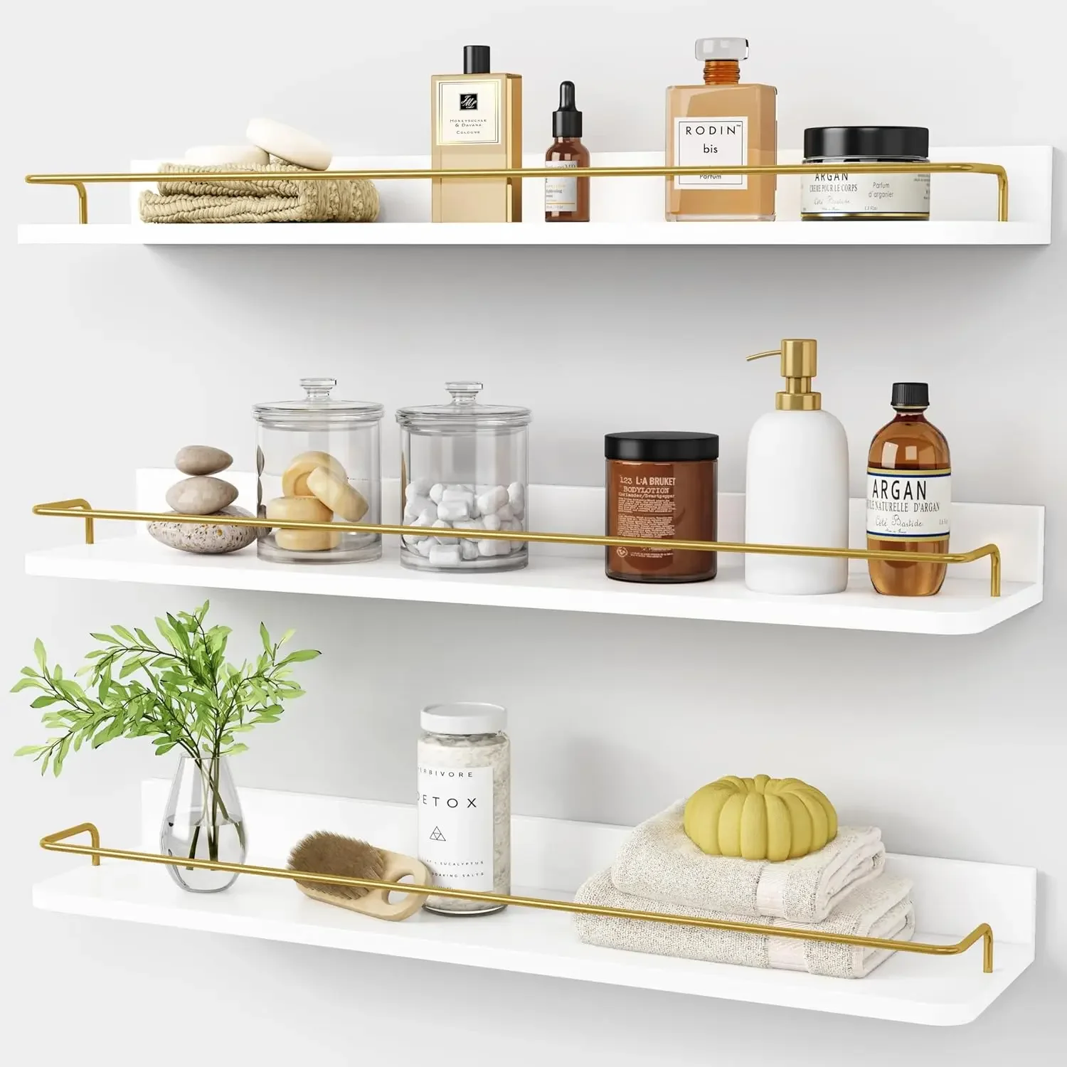 Elegant Gold Bathroom Shelves Set of 3, 24 Inch Wall Mounted Above Toilet Shelves with Rails, White and Gold for Modern Home