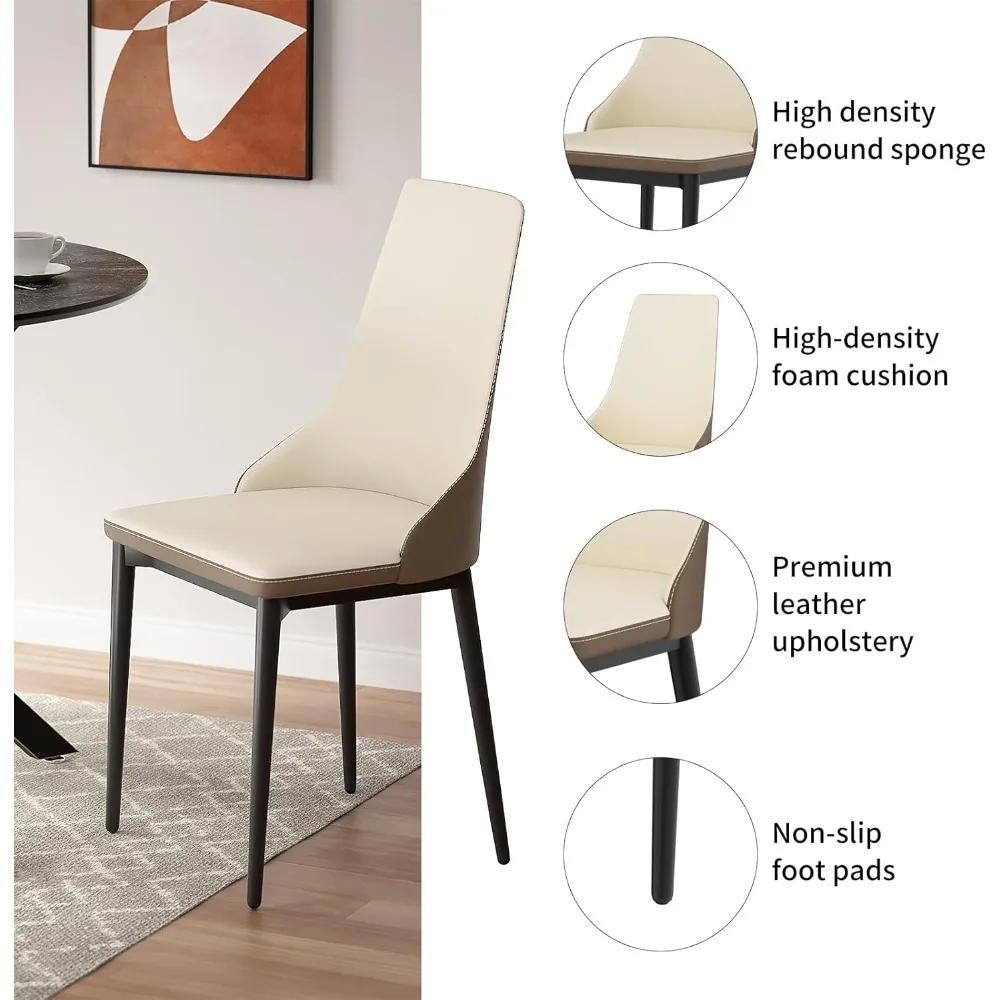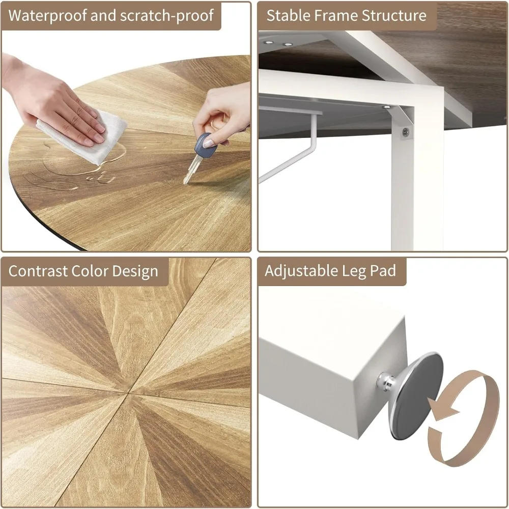 This dining set features a round table and four chairs, combining mid-century and industrial design elements. It's versatile for various uses, such as dining, coffee, or tea tables. The table's durable, waterproof surface is easy to clean, ensuring a convenient and elegant dining experience. Crafted from high-quality medium-density fiberboard with a patchwork pattern, the 47-inch round dining table is supported by a metal frame. It offers two layers of storage racks for additional space and organization. The ample tabletop is ideal for placing tableware, decorative plants, and desserts. The table's four square legs provide stability, and the adjustable rubber pads protect the floor and keep the table steady. The set includes four ergonomic dining chairs, upholstered in durable leather with high-density sponge cushions and backrests for comfortable support. The high backrest is designed to support the back, ensuring comfort during extended meal times. With dimensions of 47"L x 29.3"H x 19.3"W for the table and 18"L x 16"W x 36"H for each chair, the set is designed for compact spaces, such as apartments, kitchens, and living rooms, maximizing the use of limited space. The chairs can support up to 250 lbs and 350 lbs respectively. Assembly is straightforward with clear instructions and all necessary hardware included.