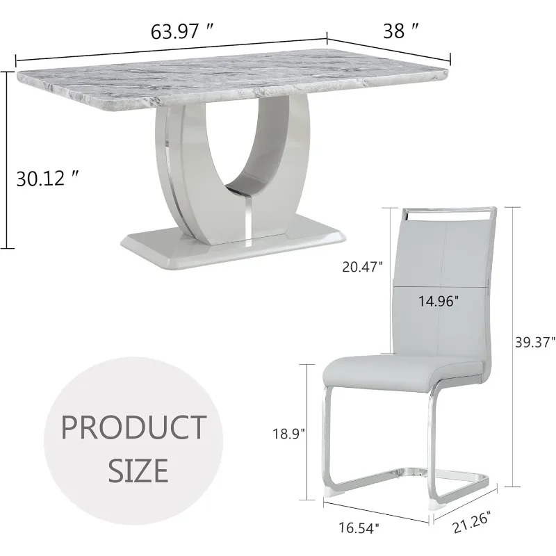 Gray 6-Person Dining Table Set - Faux Marble Top, PU Leather Chairs