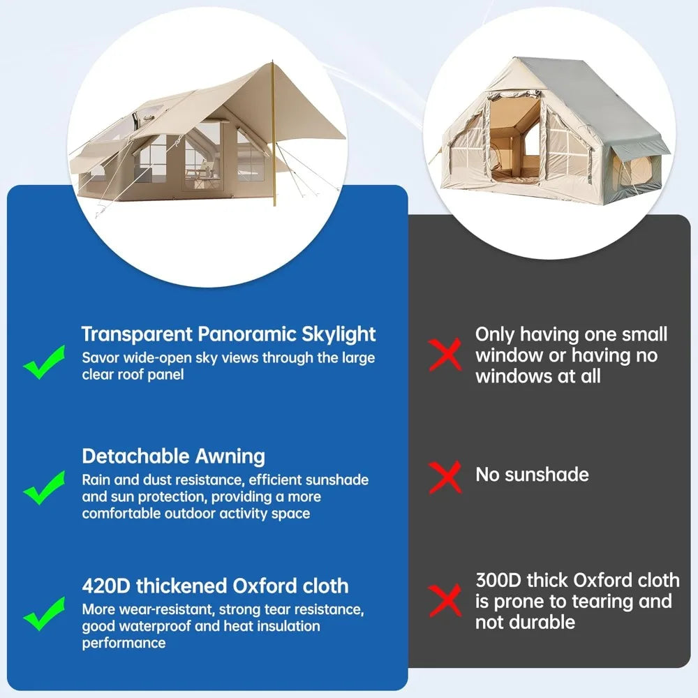【PREMIUM WATERPROOF OXFORD & UV GUARD】 Our inflatable tents for camping are crafted with tear-resistant Oxford fabric, featuring a waterproof coating and UV protection that keeps you shaded and dry from sun to storm. Reinforced seams and stress points ensure this inflatable tent is reliable for true 4-season adventures.