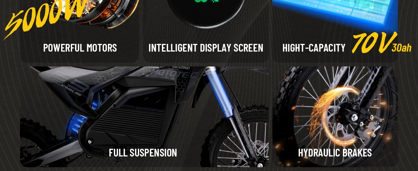 KOOZ HP117E 72V 5000W Pro Electric Dirt Bike for Adults,3 Speed Modes Electric Motorcycle Up to 50 MPH & 40 Miles Long-Range