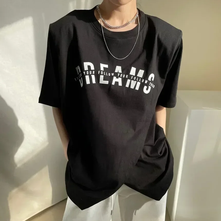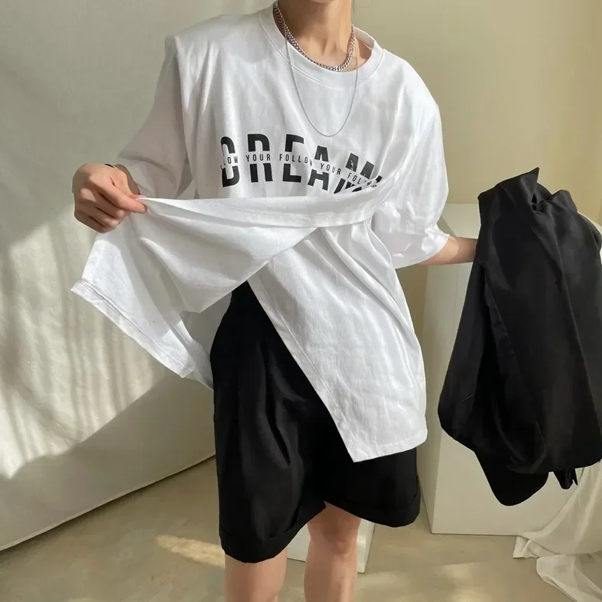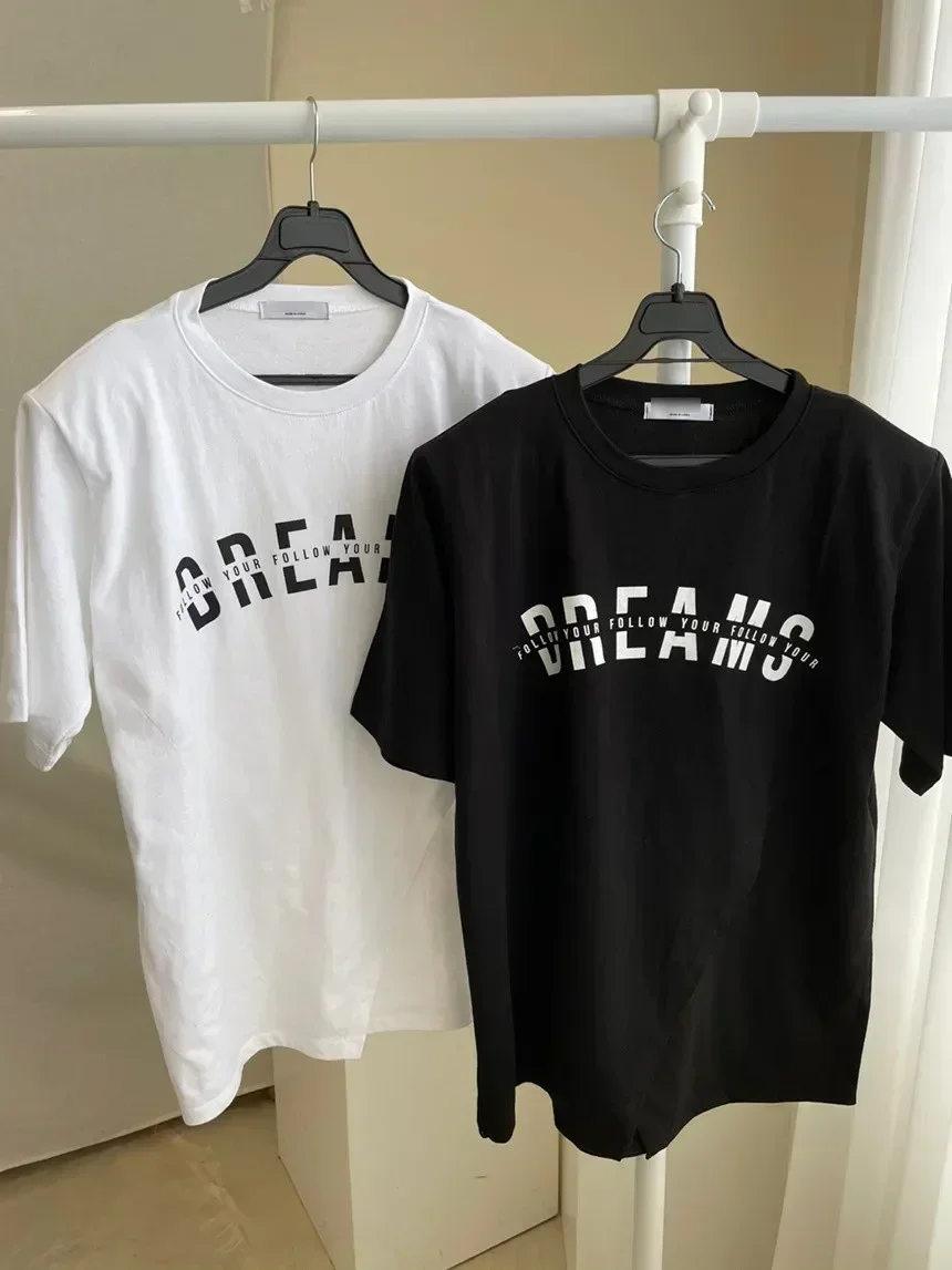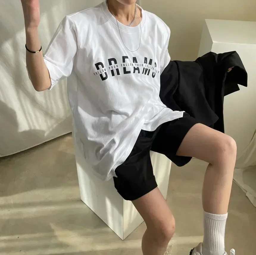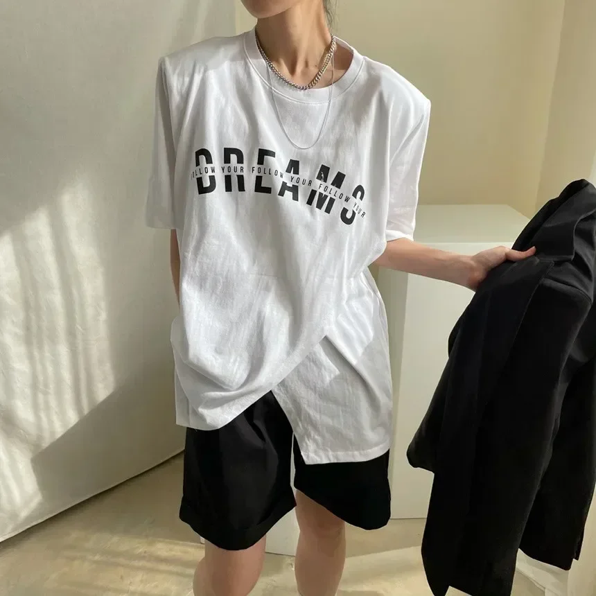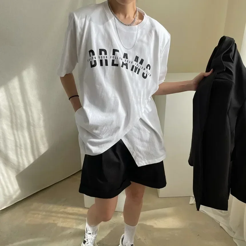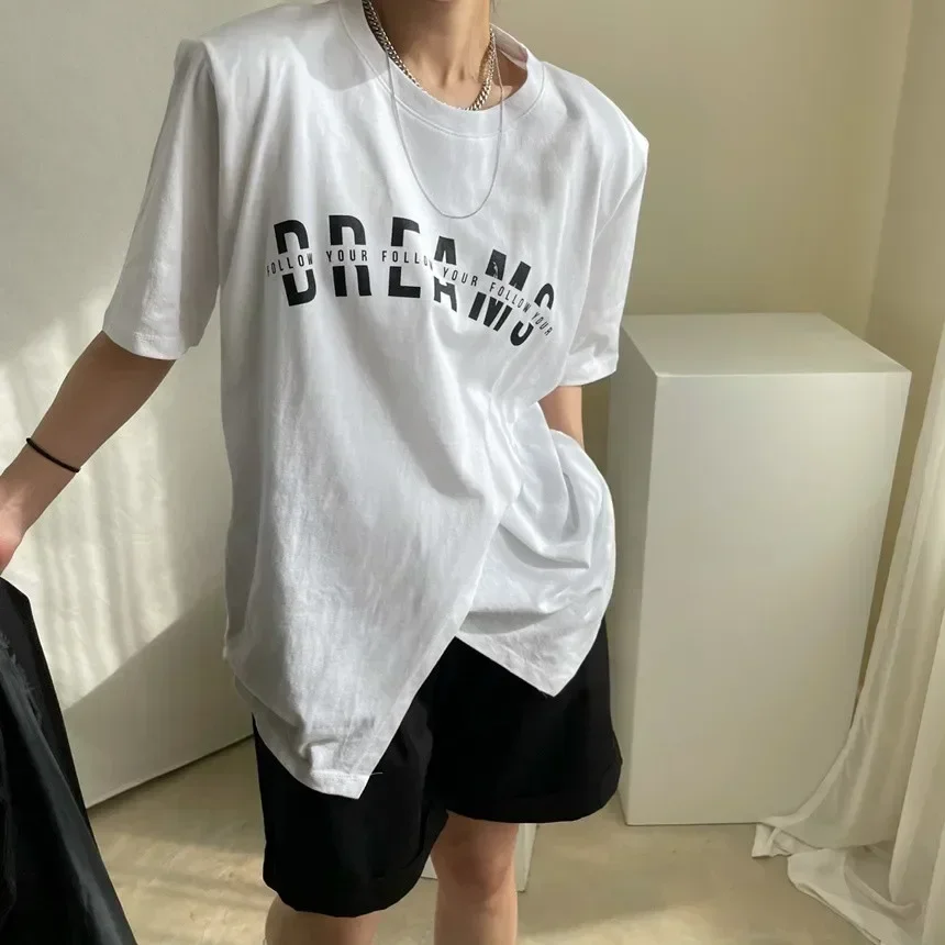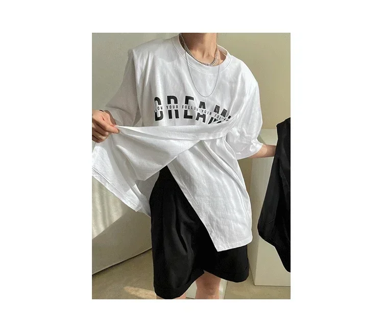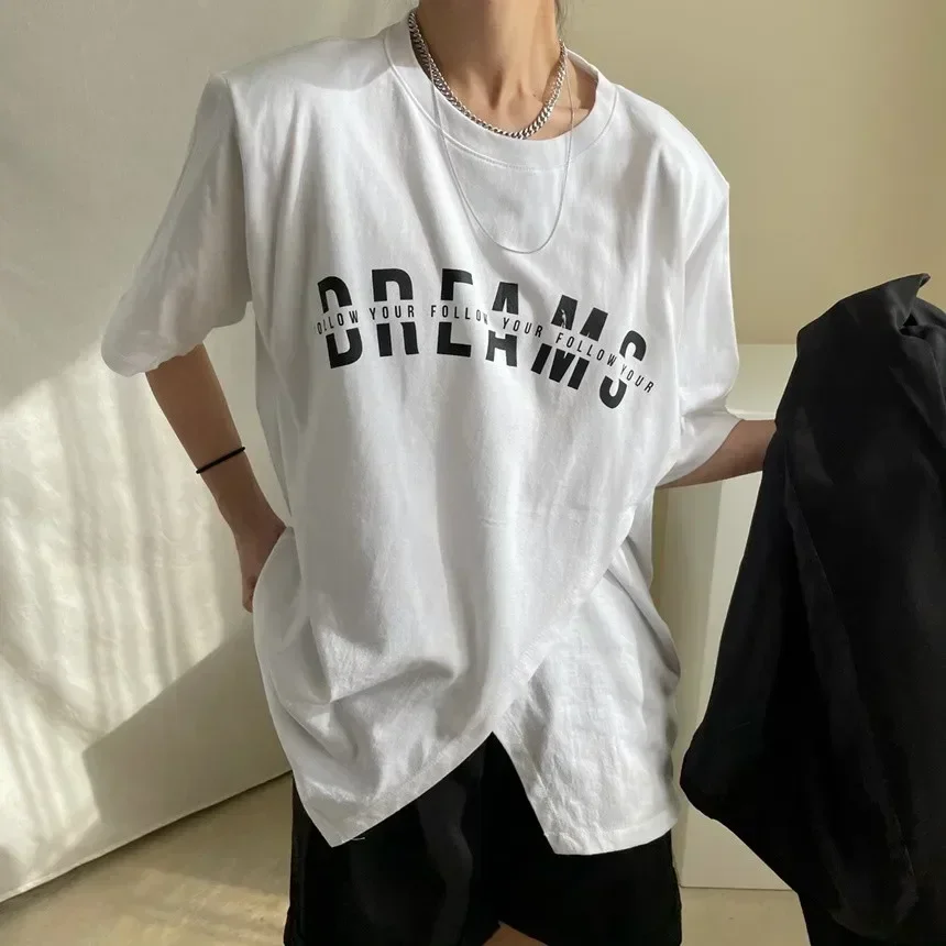 Korean Chic Versatile Niche Round Neck Loose Pullover Letter Print Asymmetrical Slit Design Short-Sleeved T-Shirt for Women