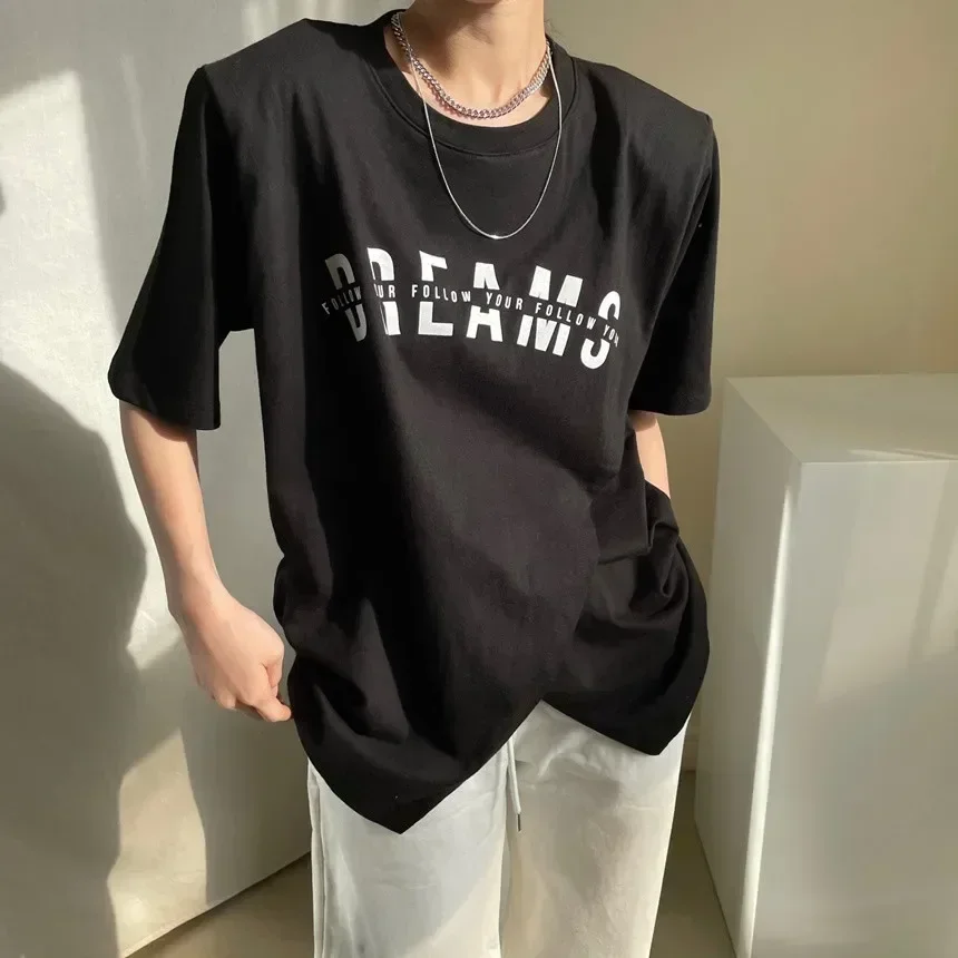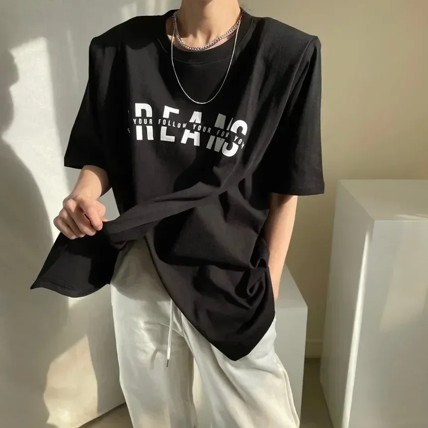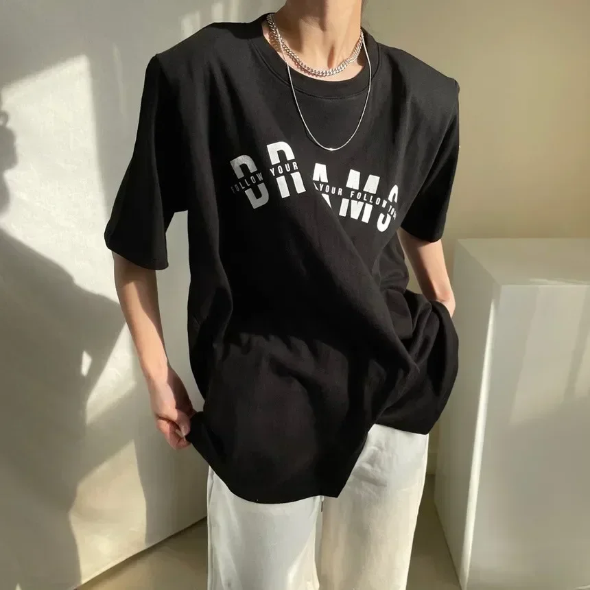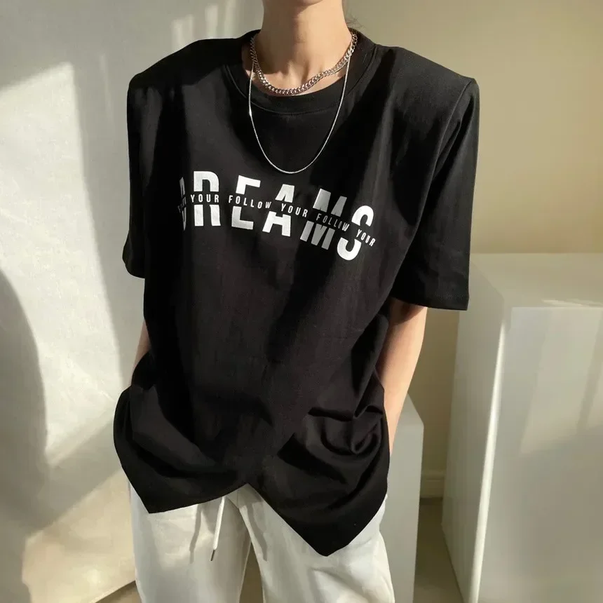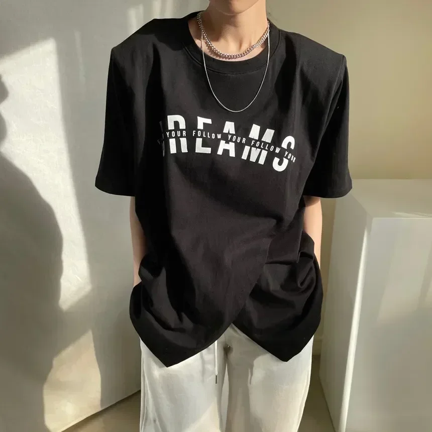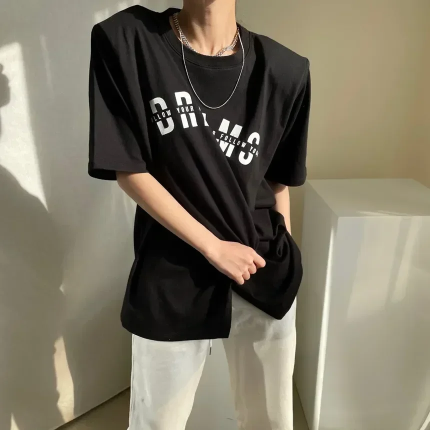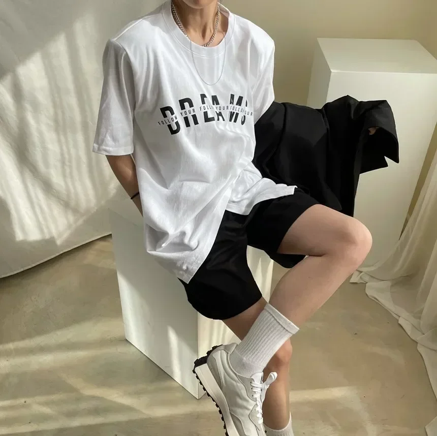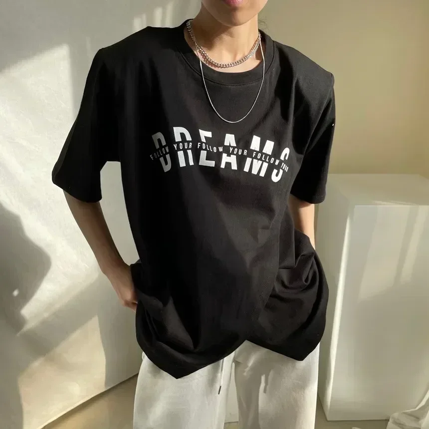 Korean Chic Versatile Niche Round Neck Loose Pullover Letter Print Asymmetrical Slit Design Short-Sleeved T-Shirt for Women