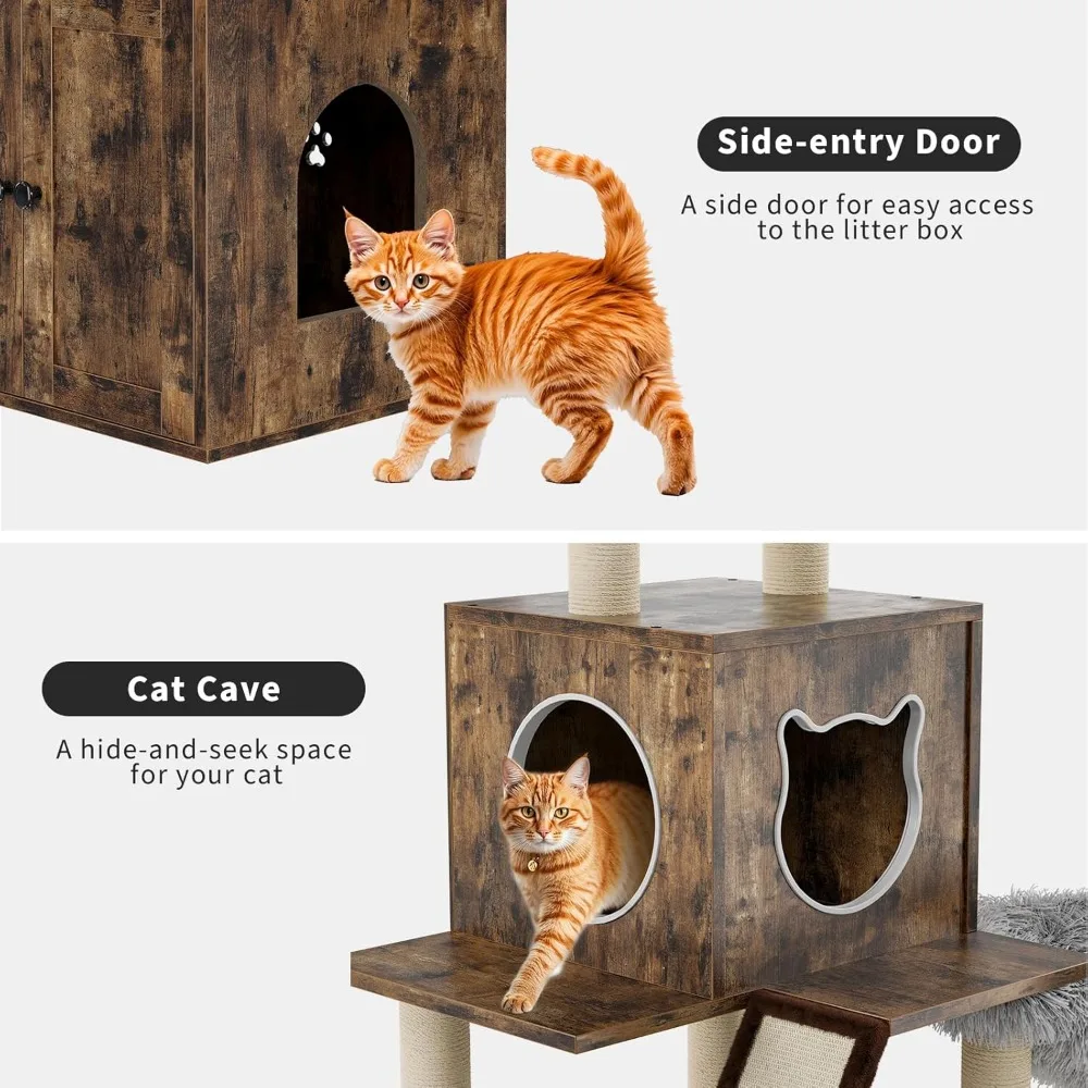 This cat house is a 2-in-1 furniture that combines a comfortable cat tree with a discreet litter box enclosure, providing your cat with a space to climb, scratch, and rest while saving space with its compact design. It features a modern design with grey and Oak Brown colors, making it a stylish addition to any home decor. The large compartment measures 30.7 inches by 19 inches by 15.8 inches and can be used to house a litter box, serve as a cozy cat house with a bed, or store cat supplies such as food, treats, and toys. The surface is easy to clean with a smooth veneer, and the cushions are removable and washable for easy maintenance. Made from durable MDF and reinforced with natural sisal, this cat condo is stable for climbing, resistant to sharp claws, and built to withstand daily use for long-lasting enjoyment.