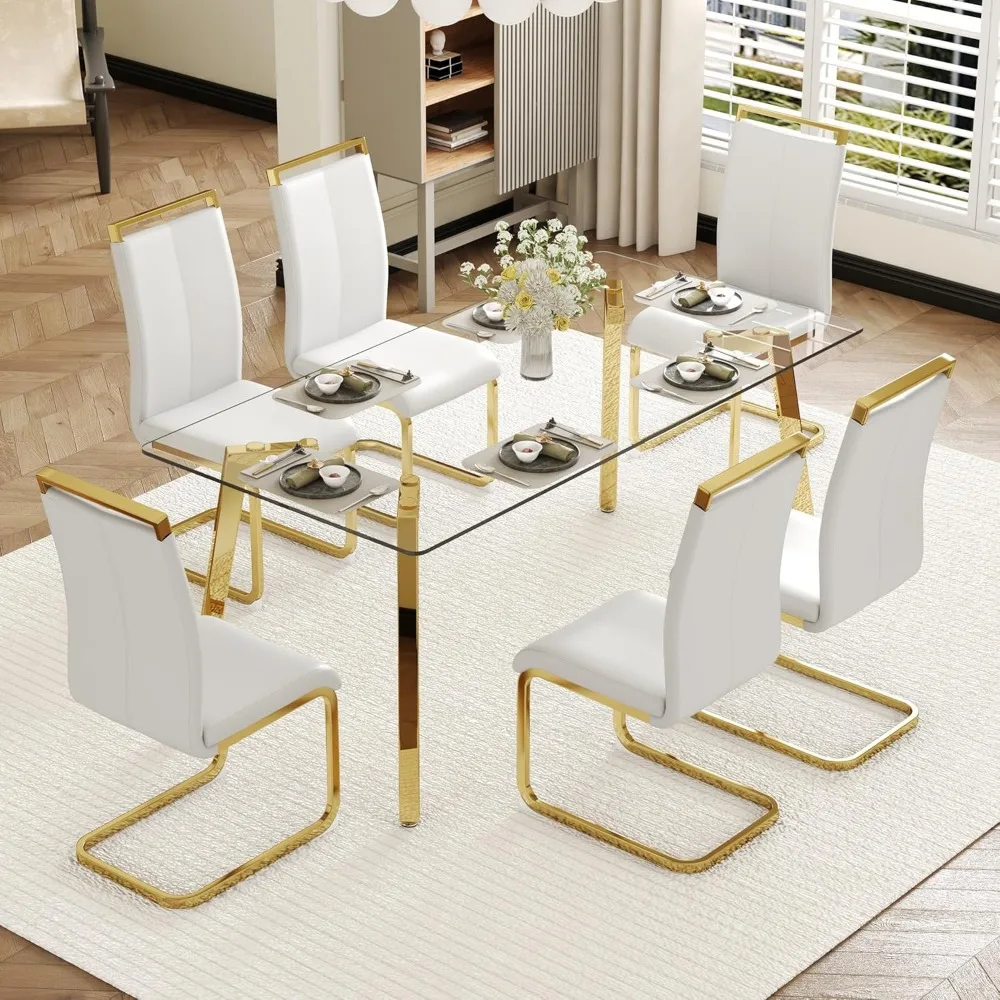 Modern Dining Table Set for 6,Glass Kitchen Table and Chairs,71''Gold Dining Room Table &Generous Legroom with 6 White