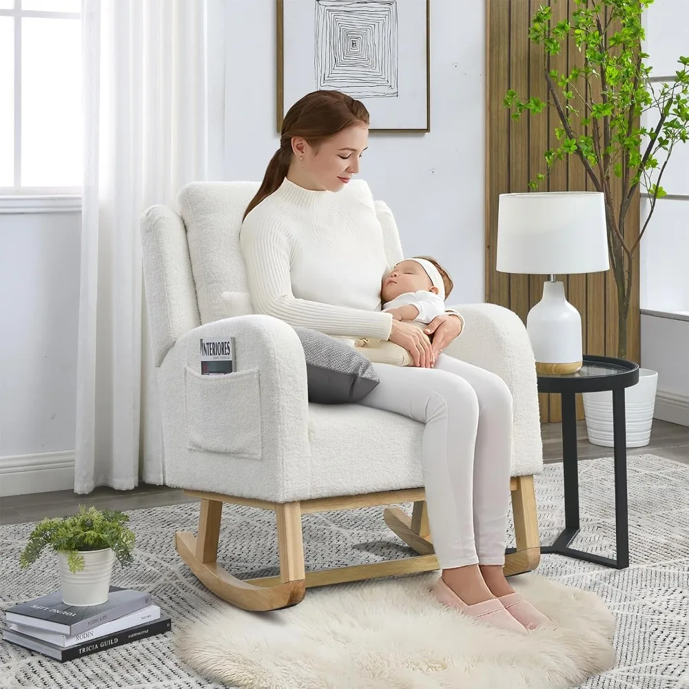 Smooth Rocking: The nursery rocking chair has excellent curved legs with non-slip pads under the base, making it rock gently and smoothly, which will instantly soothe any fussy baby. We crafted this wingback rocking chair with nursing mothers’ needs in mind Ergonomic High Back: The smooth curved armrests and ergonomic tall back cushion can provide great support for your body, effectively relieving your fatigue of the day. The lumbar pillow helps your spine maintain its natural curve and reduces pressure on your lower back, especially with the extra weight of your little one whilst breastfeeding. Fabulous Comfort: Covered with high-quality teddy fabric for a soft and breathable surface, the rocking chair brings you a luxurious yet casual sitting. A delicate curved wingback design provides a gorgeous country cottage look while also giving you the feeling of being surrounded by comfort. It would be a perfect chair whether you are wanting a modern nursery or a more traditional haven for your little bubba (Note: The back cushion is placed inside the bottom of the seat cushion.) Stylish Design: The modern wingback design makes this children's rocking chair more elegant and stylish. Also, there is a large pocket on the side of each armrest, which is convenient for you to place magazines and TV controllers. It's a good choice for lazily slapping the pages of a book or sipping a cup of coffee Reinforced Frame: Expertly crafted with kiln-dried hardwood and an engineered wood frame, the glider ricker is super strong and durable. In addition, there is an extra fixed wooden strip between the two legs for better stability. Its max capacity can reach 250LBS
