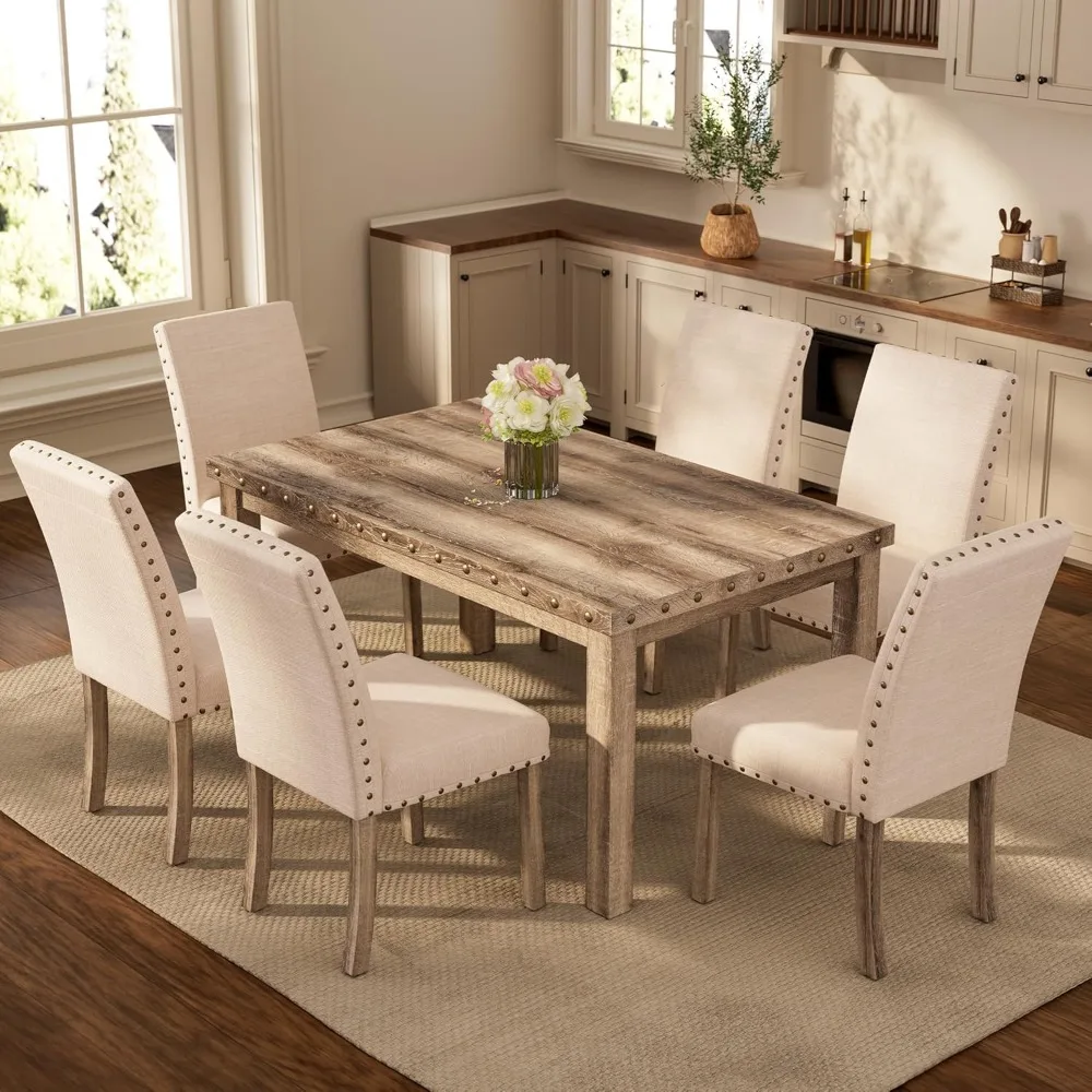 Rustic 6-Seater Dining Set | 60" Rectangular Wood Table & 6 Upholstered Chairs with Nailhead Trim
