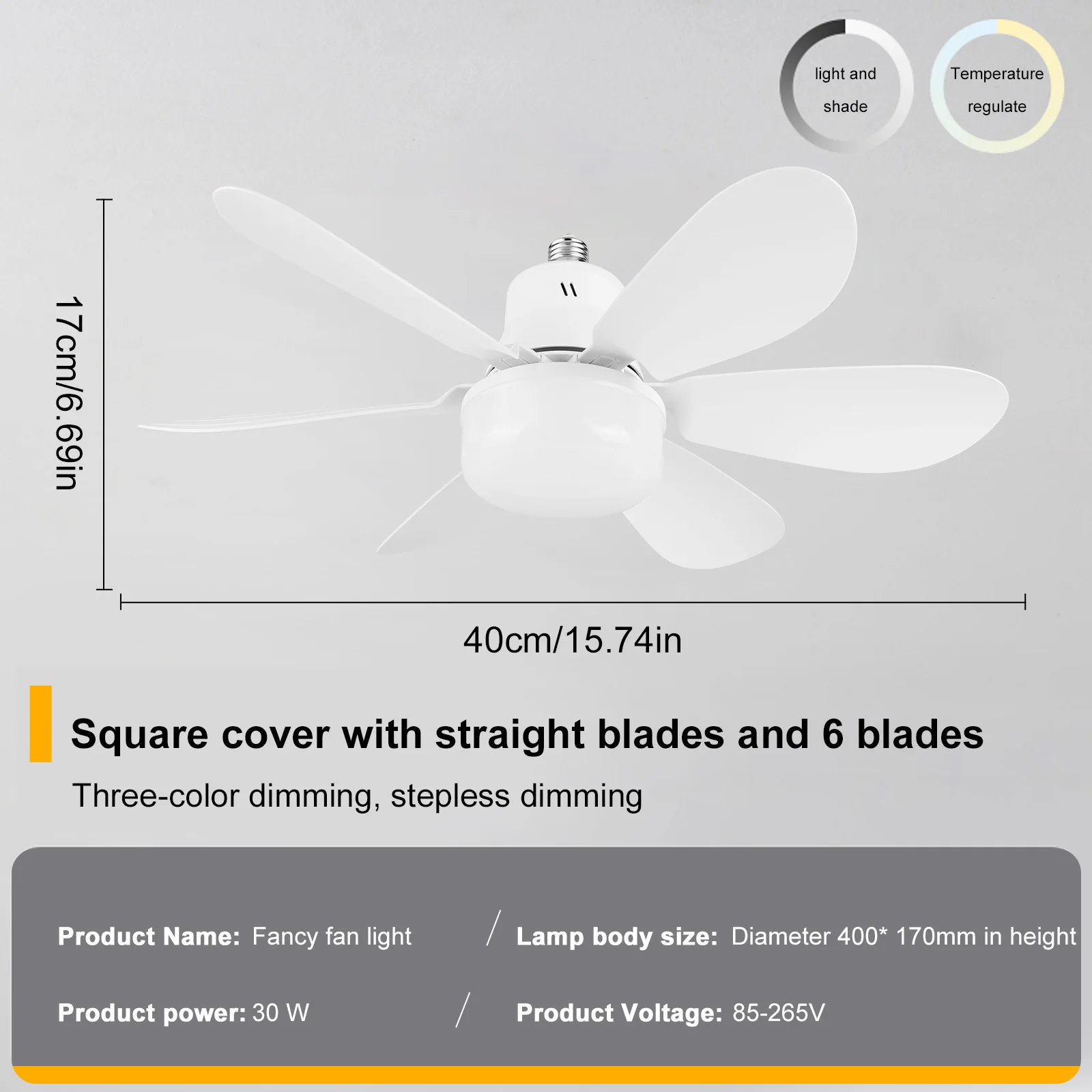 1. Stylish Versatility: The socket fan light features a sleek white design that seamlessly integrates with diverse home decor styles, making it easy to find the perfect match for your interior aesthetic and enhance your living space. 2. Convenient Control: With a user-friendly remote control, you can effortlessly adjust the light's color, brightness, and fan speed from anywhere in the room, providing a comfortable and personalized experience. 3. Customizable Lighting: Offering a color temperature range from 3000K to 6500K, this ceiling fan light allows you to tailor the lighting ambiance to suit different times and occasions, enhancing your home environment. 4. Energy Efficiency: The ceiling fan with light utilizes 18W SMD 2835 LEDs, delivering bright and effective illumination while significantly reducing energy consumption, making it both environmentally friendly and cost-effective. 5. Smart Timing Function: The screw in ceiling fan in light socket features a built-in timer, you can easily schedule the light's on and off times, enhancing convenience and promoting a smarter, safer, and more comfortable living experience.