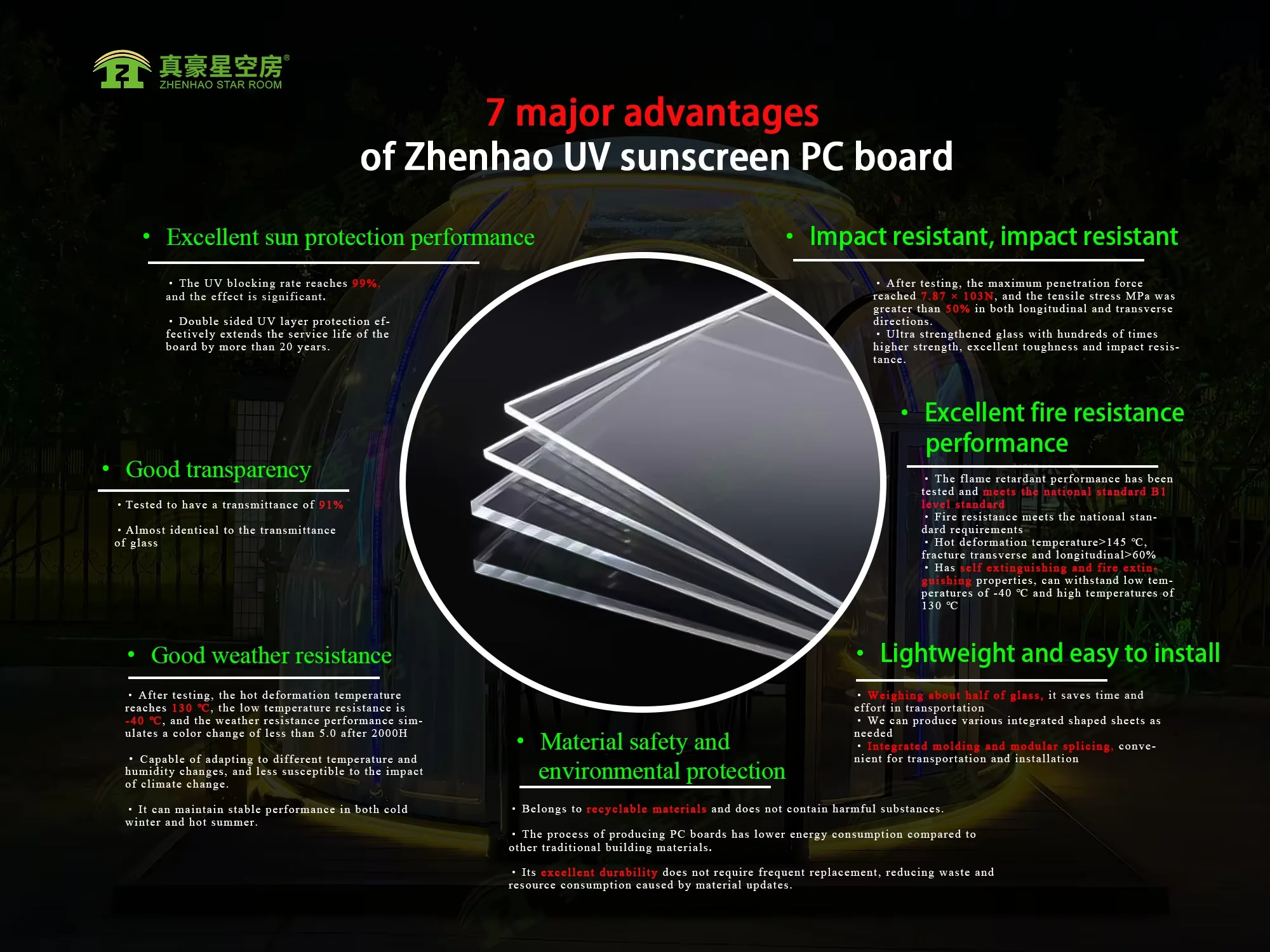 - Polycarbonate is highly resistant to impact and can withstand harsh weather conditions like strong winds, snow, and hail.