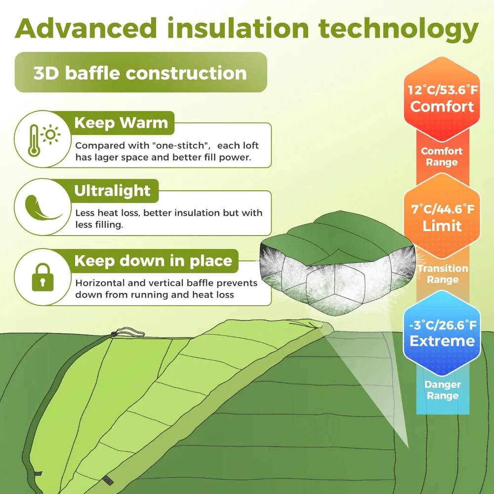 This product features a Coldmaster Down sleeping bag, crafted with imported materials. It is designed for adults and filled with 300g of Coldmaster Down, providing warmth for three seasons. The sleeping bag boasts unique vertical and horizontal baffle stitching to prevent cold spots, along with windproof drawstrings and zipper draft tubes to block chilling air flow. The bottom zipper allows for foot freedom in warmer weather, with comfort, limit, and extreme ratings of 50℉, 45℉, and 25℉ respectively. The shell and inner material of the sleeping bag are made from rugged 20D 400T high-density recycled nylon, offering eco-friendly durability. This weather-resistant fabric is designed to block moisture, retain warmth, repel stains, and be easy to clean. The sleeping bag functions as a 3-in-1 sleeping system, serving as a traditional rectangular sleeping bag, a down camping blanket, or even worn on the shoulders. It can be secured with an air pad using its reinforced corners and straps, ensuring 360° grip and stability. The wraparound design evenly distributes pressure, reducing slippage on uneven terrain. Weighing only 2.5 lbs, this ultralight and compact sleeping bag can be compressed into a football-sized 12" x 7" compression bag, which is 45% smaller than standard 3-season bags. With full-size dimensions of 78.7" x 33.5", it fits users up to 5'11" comfortably. This makes it an ideal choice for backpacking, hiking, camping, and mountaineering, as it is lightweight and easy to pack. Advanced technology is incorporated into the design with contrast color and 3D baffle technology, which consists of independent insulation lofts. This ensures that the down is evenly distributed and stable, preventing it from running and effectively locking in heat.