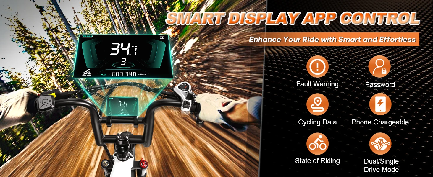 【𝟓 𝐑𝐢𝐝𝐢𝐧𝐠 𝐌𝐨𝐝𝐞𝐬 & 𝐀𝐩𝐩 𝐂𝐨𝐧𝐭𝐫𝐨𝐥】W Wallke Electric bike for adults offers 5 different riding modes,To customize your ride according to your preferences and conditions:Switch between Throttle, Pedal Assist, Walking Modes, and Single/Dual Drive Modes to effortlessly switch between long-distance travel and exercise.This electric bike features a full-color screen with USB port that lets you monitor key information such as battery level, distance traveled, speed,and riding mode.