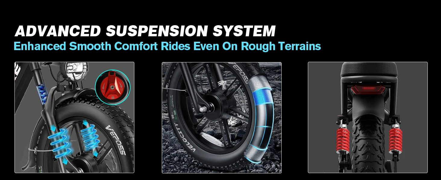 【𝐅𝐮𝐥𝐥 𝐒𝐮𝐬𝐩𝐞𝐧𝐬𝐢𝐨𝐧 𝐒𝐲𝐬𝐭𝐞𝐦】with 4-piston 203mm hydraulic disc brakes, this e-bike offers superior stopping power, ensuring safety and control at high speeds. Paired with a lockable hydraulic suspension and an aluminum rear shock absorber, it’s built to absorb shocks and smooth out bumps, providing a more comfortable ride.