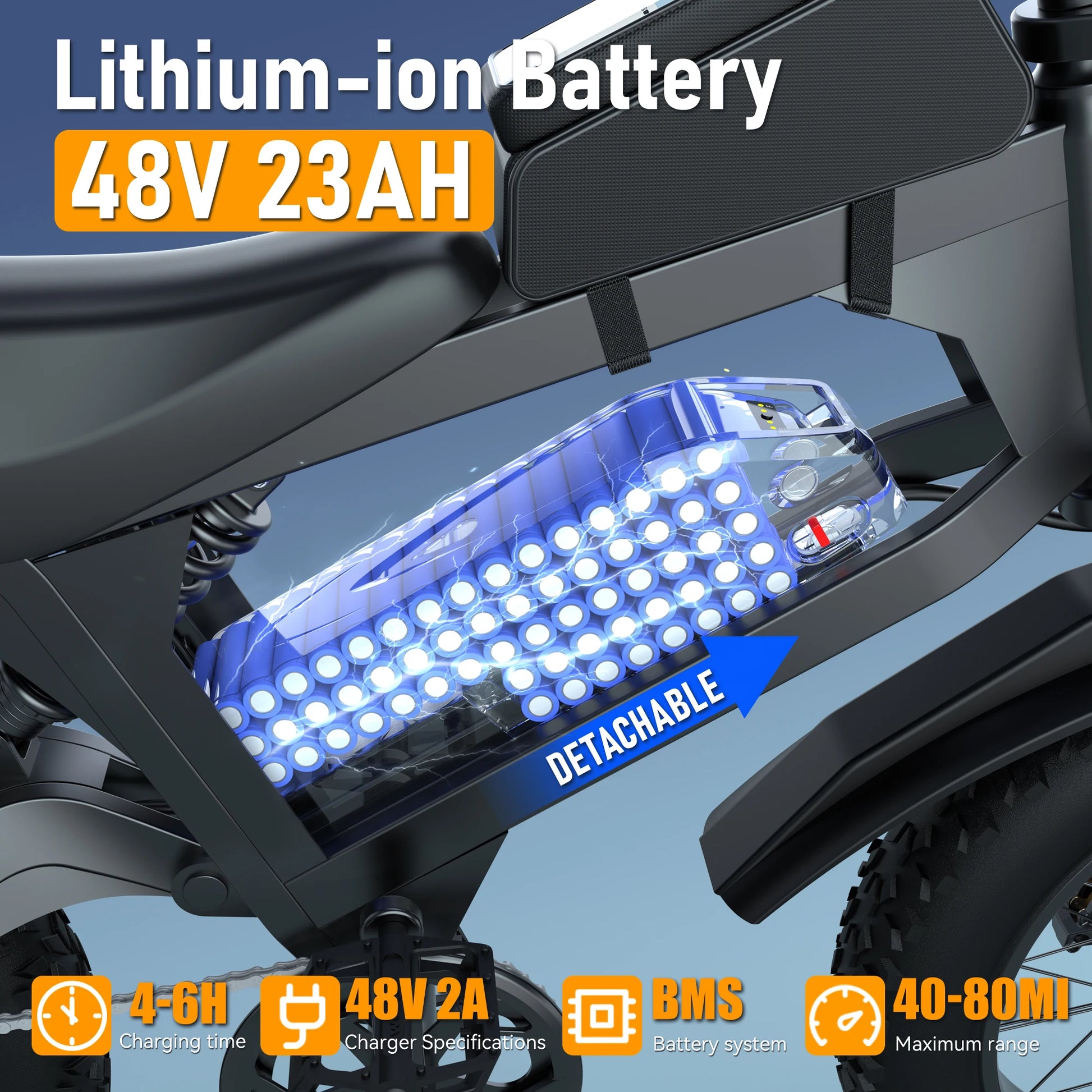The adult dirt bike offers three riding modes: pure electric, electric assist, and pedal. It features a removable 48V 23AH lithium-ion battery, providing a range of up to 50 miles in pure electric mode and up to 80 miles in pedal assist mode. The UL-certified battery incorporates BMS security protection and power-saving capabilities. With a fast charging time of 6-8 hours at 2A, you can quickly get back on the road.